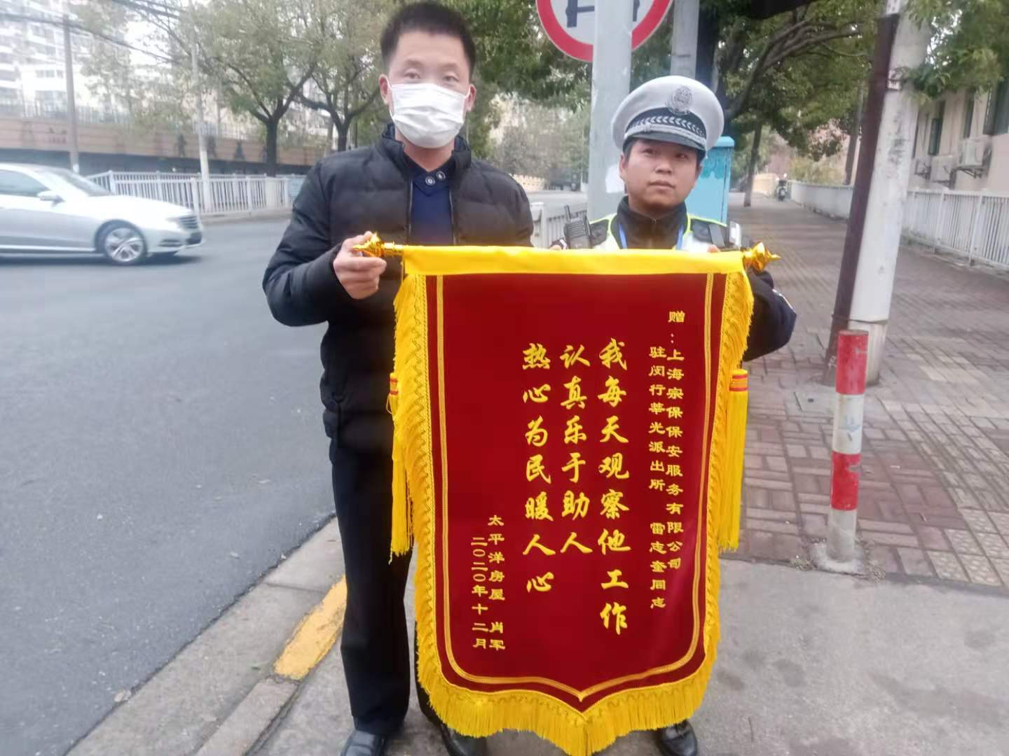 12月17日,宗保公司駐閔行莘莊梅隴交管輔警雷志奎收到一面繡有“我每天觀察他工作認(rèn)真樂(lè)于助人 熱心為民暖人心”的錦旗。