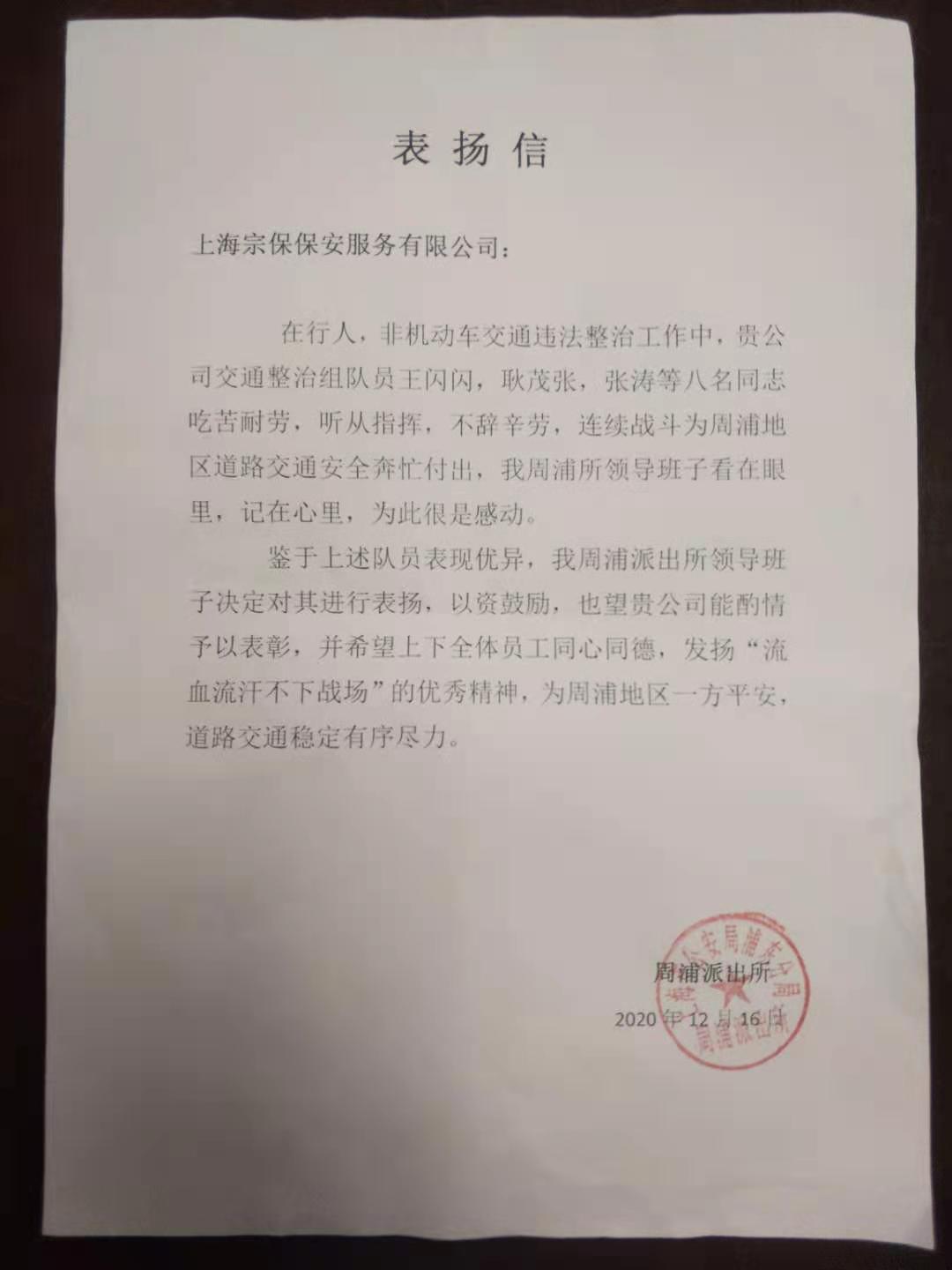 12月16日,宗保公司周浦輔警項(xiàng)目收到周浦派出所送來(lái)的表?yè)P(yáng)信,信中對(duì)工作表現(xiàn)優(yōu)秀的王閃閃、耿茂張、張濤等八名同志提出特別表?yè)P(yáng)。