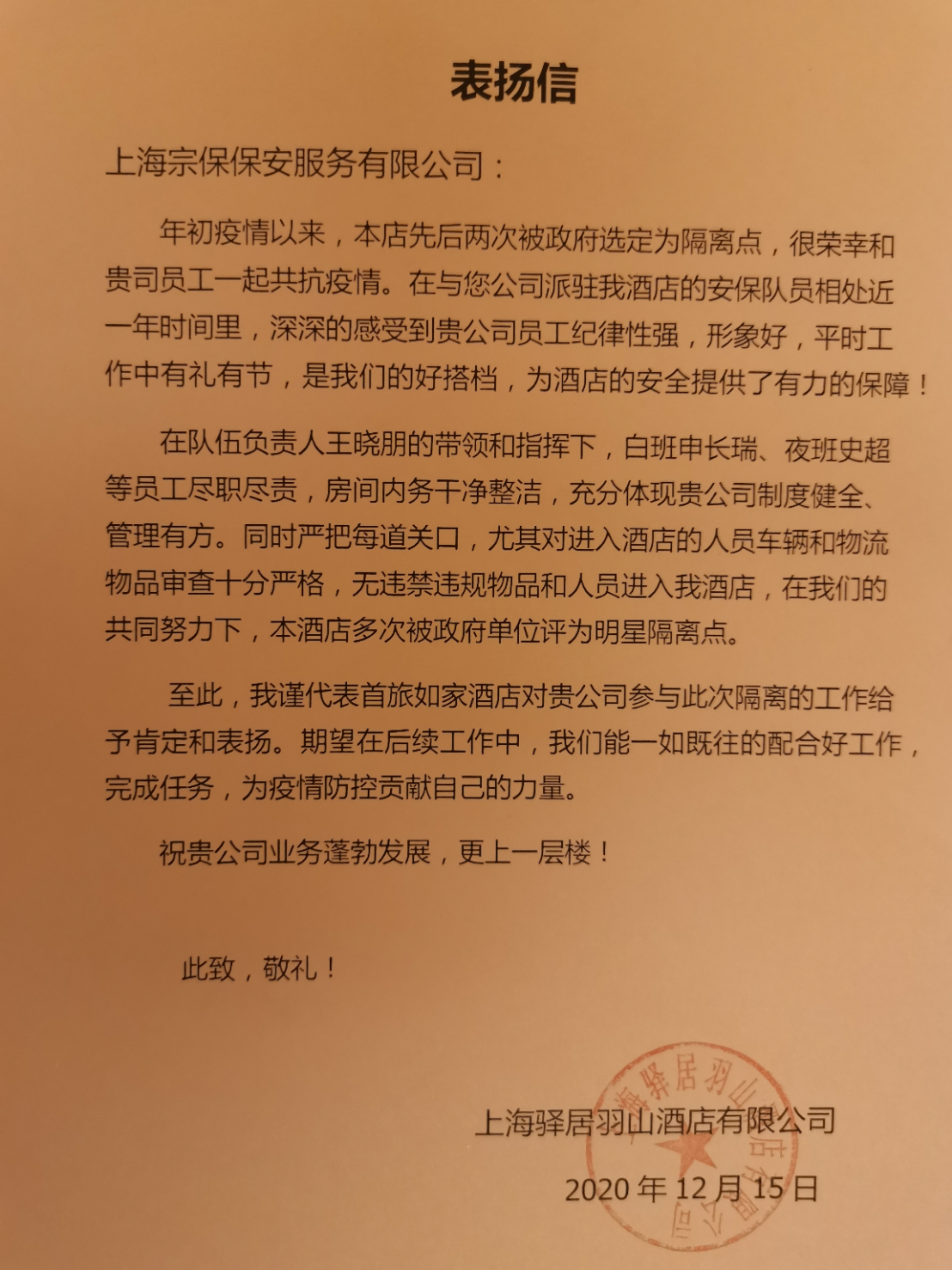 12月15日,宗保公司駐洋涇輔警項(xiàng)目收到上海驛居羽山酒店有限公司送來(lái)的表?yè)P(yáng)信,信中對(duì)項(xiàng)目隊(duì)長(zhǎng)王曉朋,隊(duì)員申長(zhǎng)瑞、史超的出色表現(xiàn)提出特別表?yè)P(yáng)。