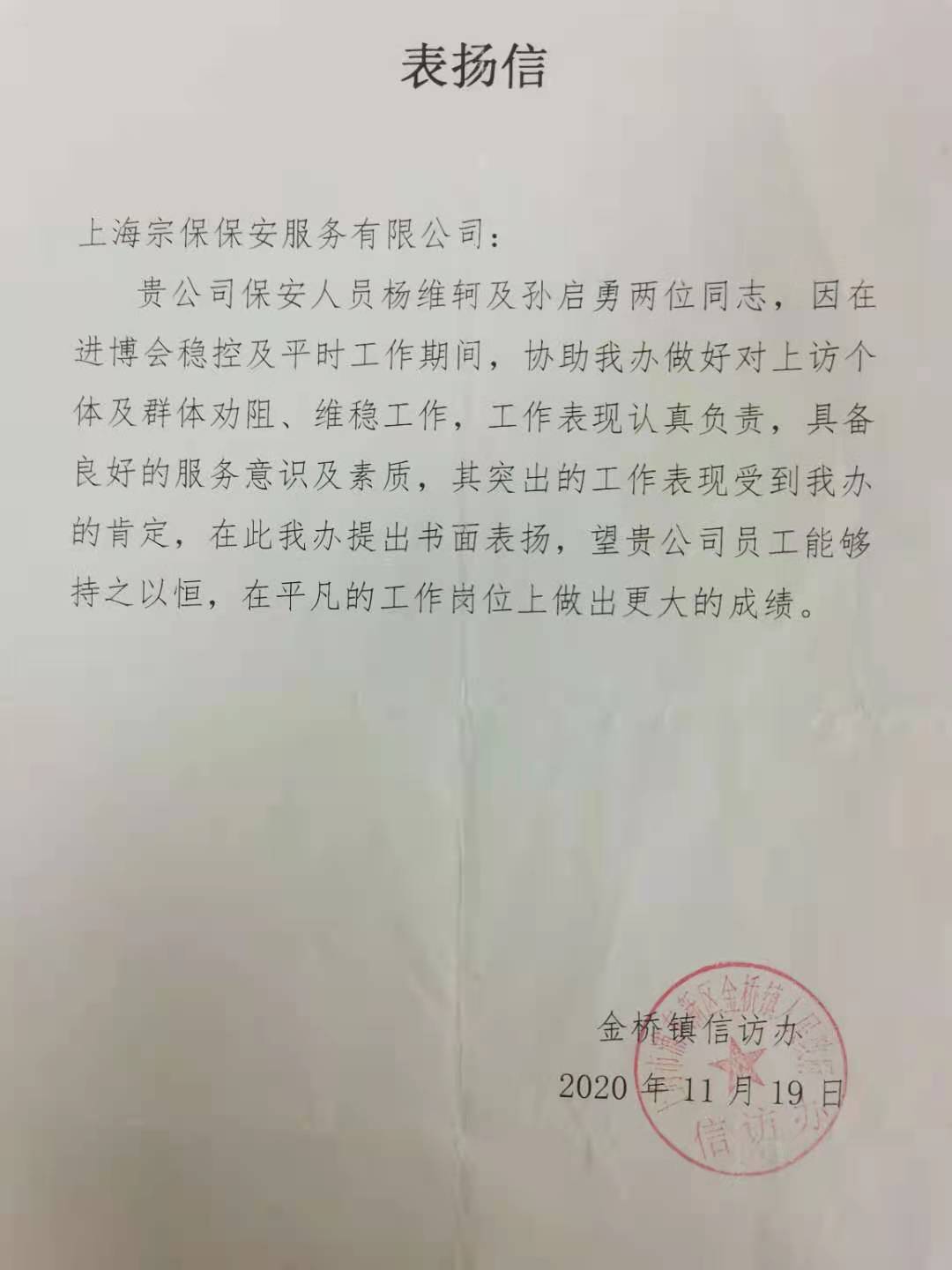 11月19日,宗保公司金橋輔警項(xiàng)目收到金橋信訪辦送來(lái)的表?yè)P(yáng)信,信中對(duì)項(xiàng)目隊(duì)員楊維軻、孫啟勇提出特別表?yè)P(yáng)。