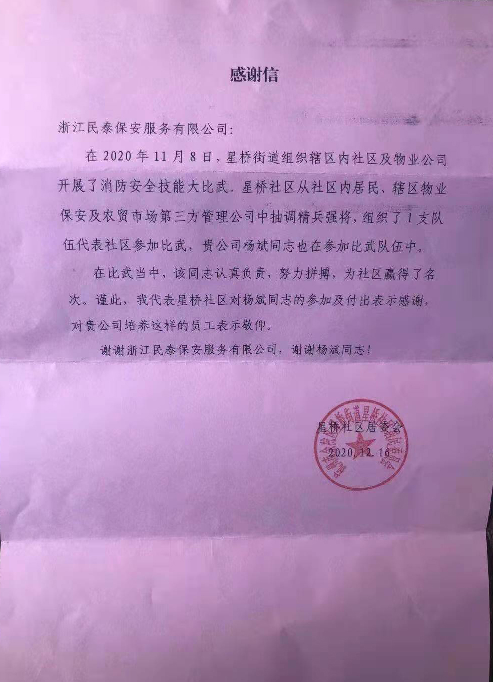 12月16日,浙江民泰星橋農(nóng)貿(mào)市場(chǎng)項(xiàng)目收到一封星橋社區(qū)居委會(huì)送來(lái)的表?yè)P(yáng)信,信中對(duì)在消防安全技能大比武中表現(xiàn)優(yōu)秀的楊斌提出特別表?yè)P(yáng)。