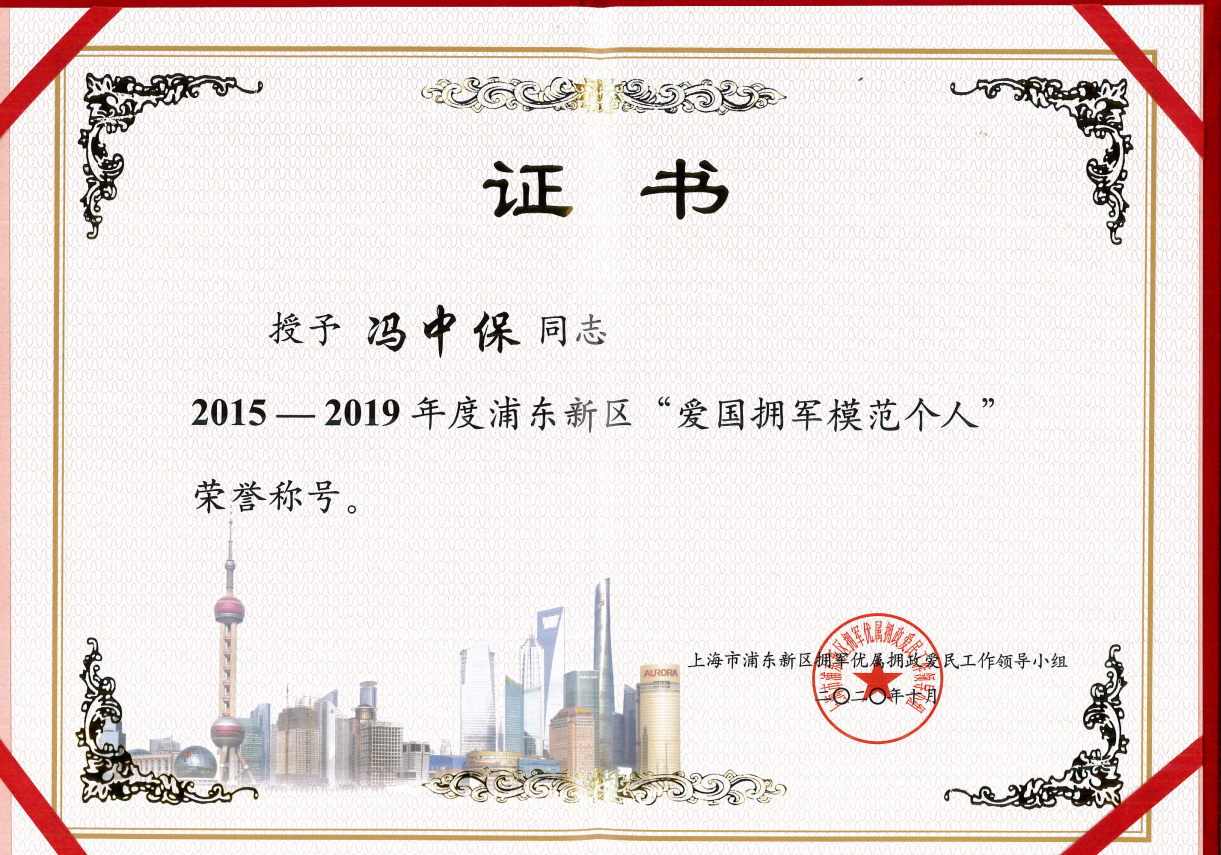 市委常委、浦東新區(qū)區(qū)委書記翁祖亮和上海警備區(qū)副政委周夕根少將出席大會(huì),共同為浦東“全國雙擁模范城”五連冠獎(jiǎng)牌揭牌。宗保公司被評(píng)為2015-2019上海市愛國擁軍模范單位、2015-2019浦東新區(qū)愛國擁軍模范單位,公司創(chuàng)始人馮中保被授予2015-2019年度浦東新區(qū)“愛國擁軍模范個(gè)人”榮譽(yù)稱號(hào)。