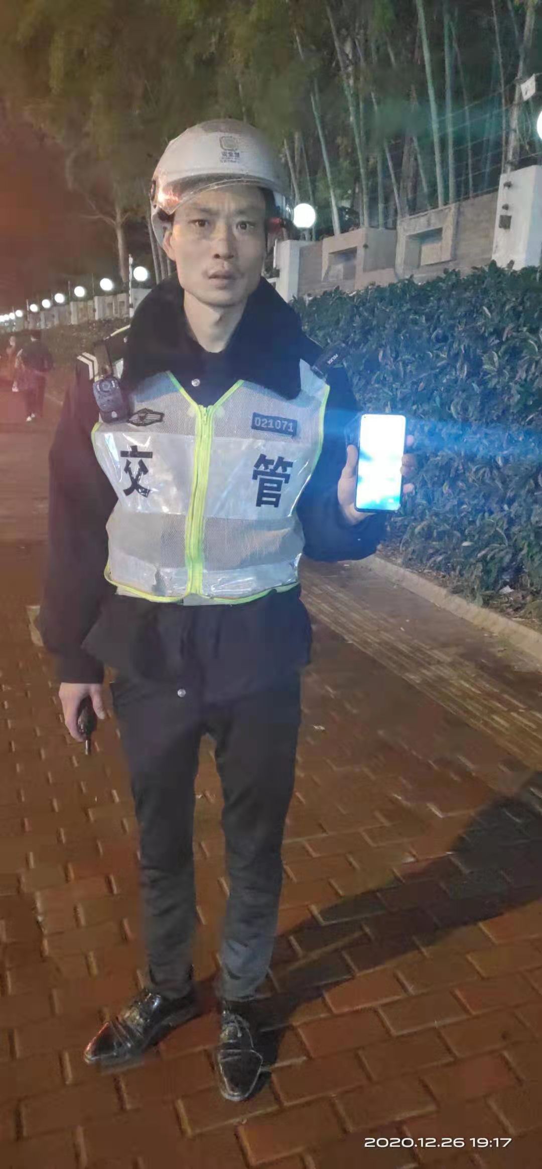 當(dāng)天19:30左右,方鴻曉在虹泉銀亭路口值勤時,撿到一部手機(jī),詢問路人無人認(rèn)領(lǐng),便上報帶班組長。