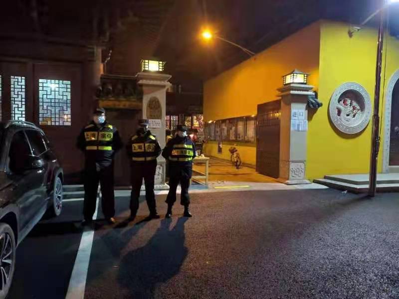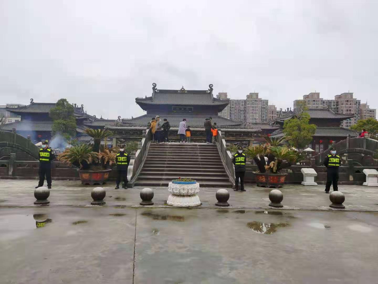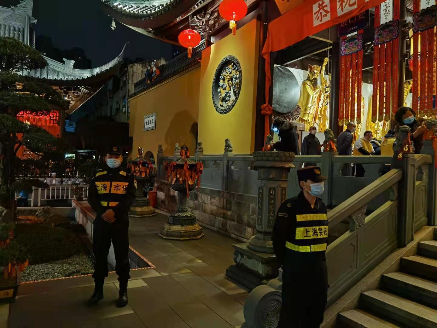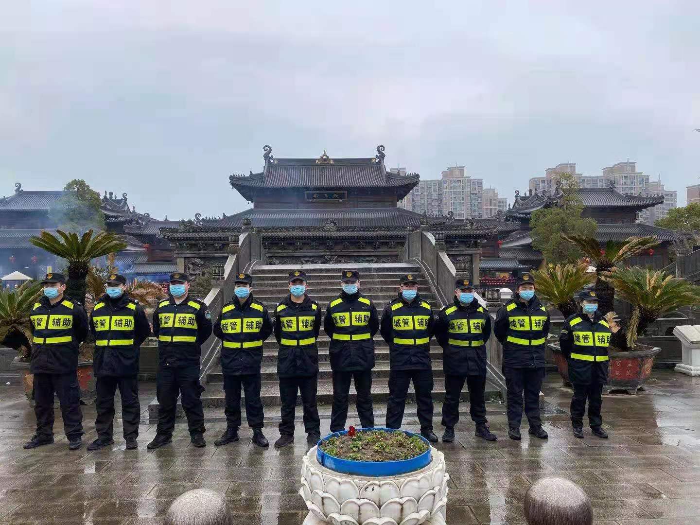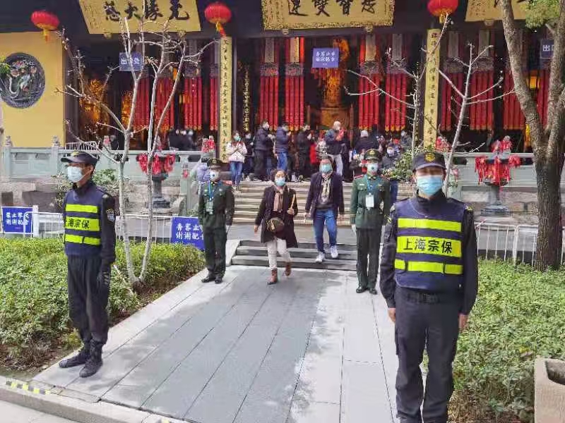 春節(jié)期間,眾多市民群眾到名寺古剎燒香祈福。為確保寺廟祈福活動場所安全有序,除夕當(dāng)天,宗保公司在公安民警和甲方領(lǐng)導(dǎo)的指導(dǎo)下,派出精干隊員全力參與上海、杭州兩地18座寺廟的秩序維護(hù)保障工作。