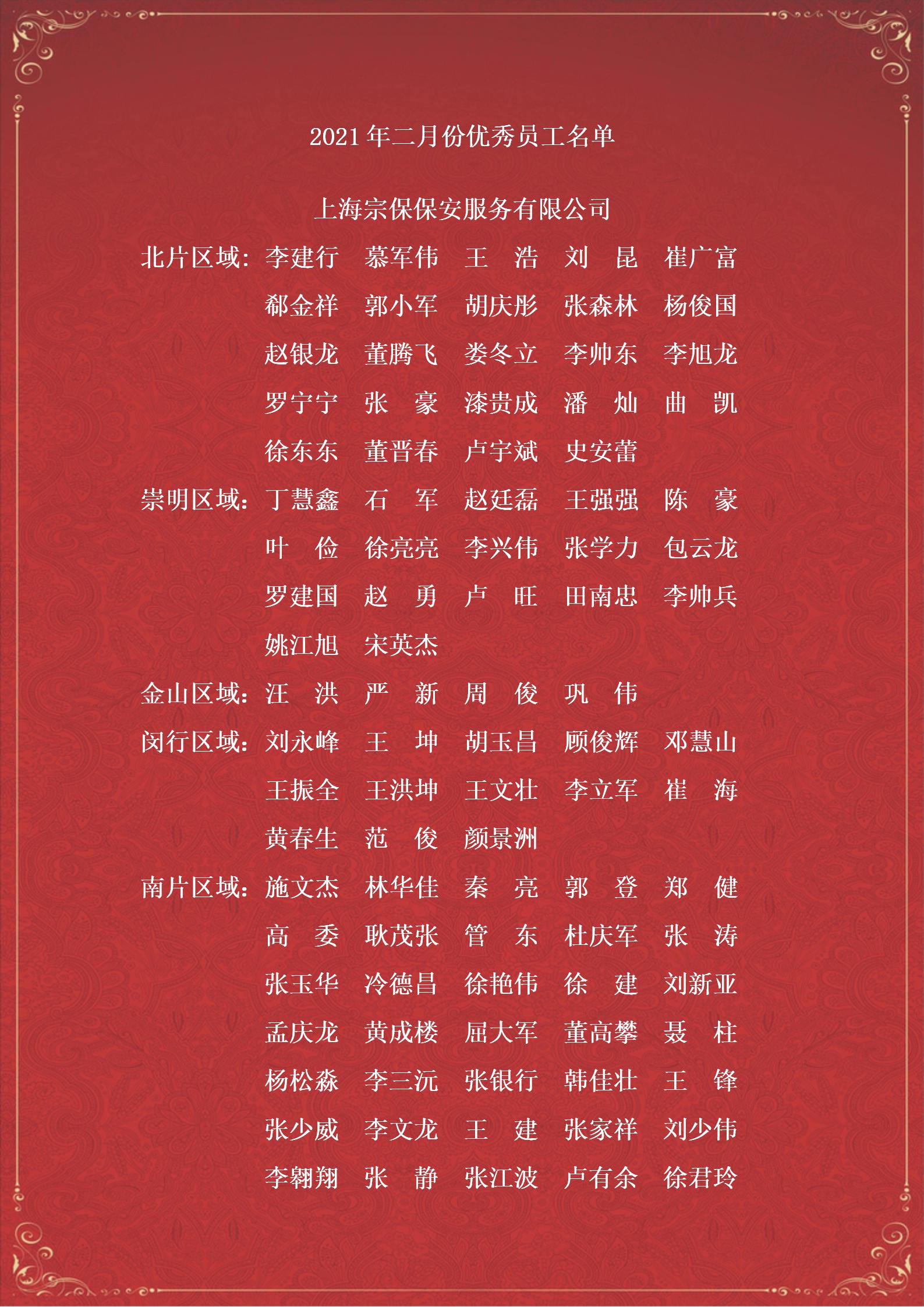 二月份正值2021年新春佳節(jié),廣大員工響應(yīng)“疫情防控非必要不返鄉(xiāng)”的號召,舍棄與家人團(tuán)聚,不分心不走神,按照甲方的要求,服從公司的部署,凝心聚力,積極投入到各項輔助安全保障、市容協(xié)管工作之中,期間涌現(xiàn)出了一批表現(xiàn)突出的優(yōu)秀個人。為表彰先進(jìn),樹立典型,激勵后進(jìn),在各項目推薦,各部門審定把關(guān)的基礎(chǔ)上,經(jīng)公司董事會研究,決定對2月份工作表現(xiàn)優(yōu)異的李建行等157名優(yōu)秀員工,予以通報表彰獎勵(獎金已隨二月份工資發(fā)放)。