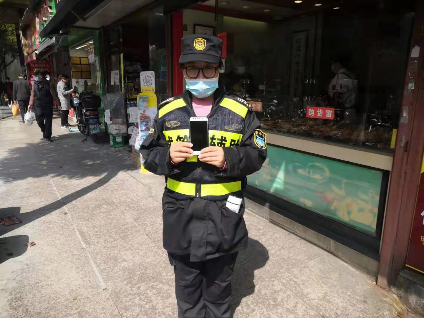 當(dāng)日9:30,趙娟在東南菜市場(chǎng)巡邏時(shí),在弄堂口旁邊撿到一部手機(jī),便立即上報(bào)當(dāng)班組長(zhǎng)。