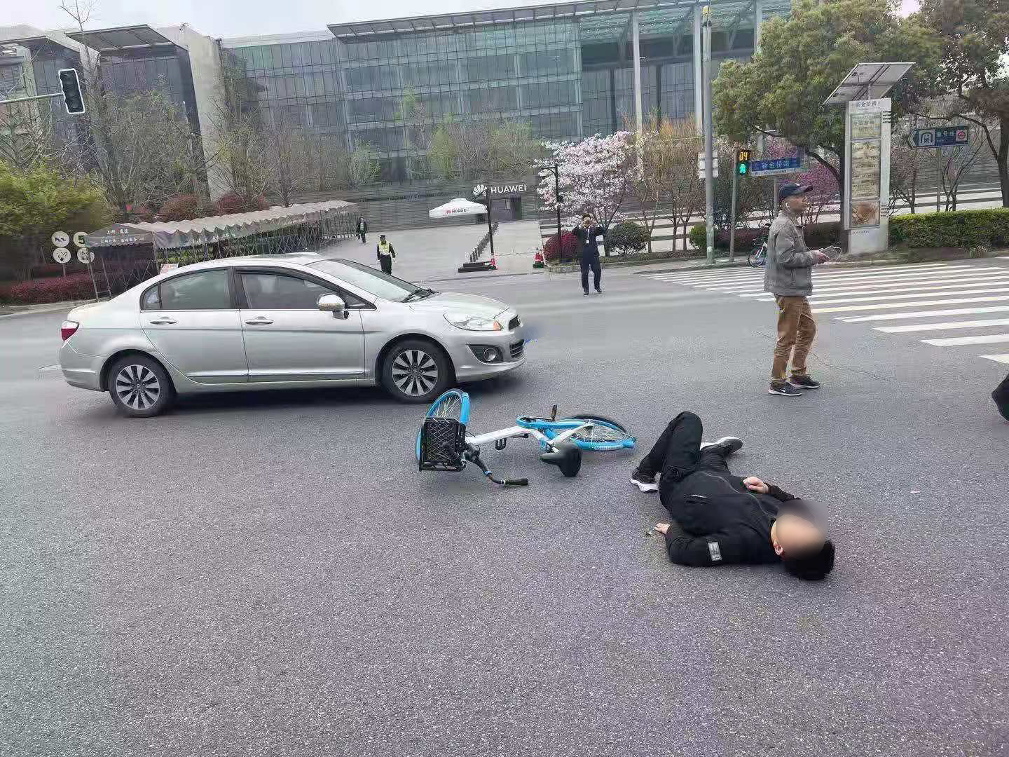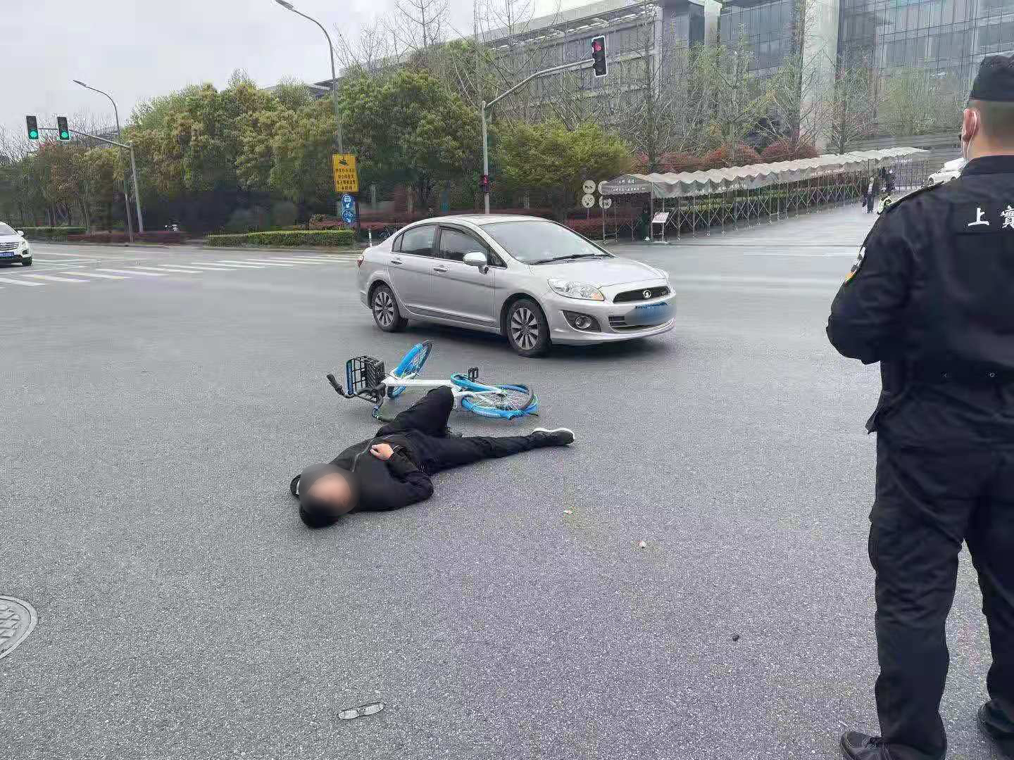 當(dāng)天9:10左右,盧迎輝在新金橋路金蘇路華為南門(mén)早高峰值勤時(shí),遇到一起交通事故,一位騎單車的男子與行駛中的小轎車相撞,男子當(dāng)即被撞出去三四米遠(yuǎn),倒在地上抽搐不止。