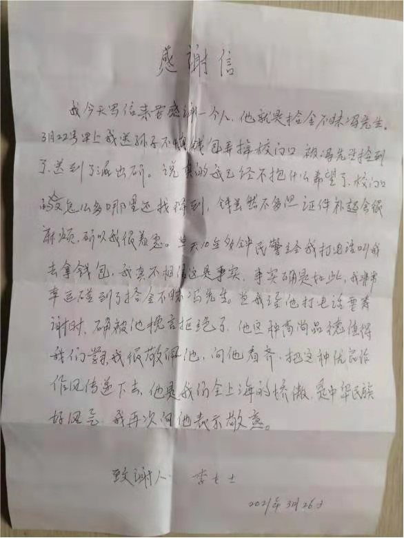 3月26日,宗保公司駐三林市容項目收到市民李女士送來的感謝信,贊揚馮四軍和杜祖峰拾金不昧的行為。