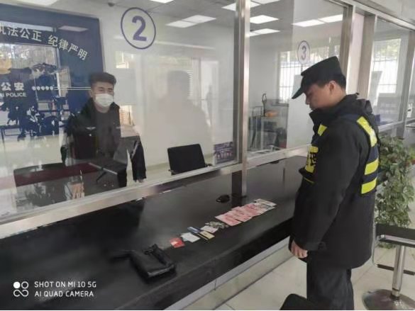 隨后,杜祖峰隨組長將錢包送到派出所,在民警的監(jiān)督下清點物品,內有現金841元、身份證、銀行卡、社保卡等證件,兩人將錢包上交民警后,便悄然離開。