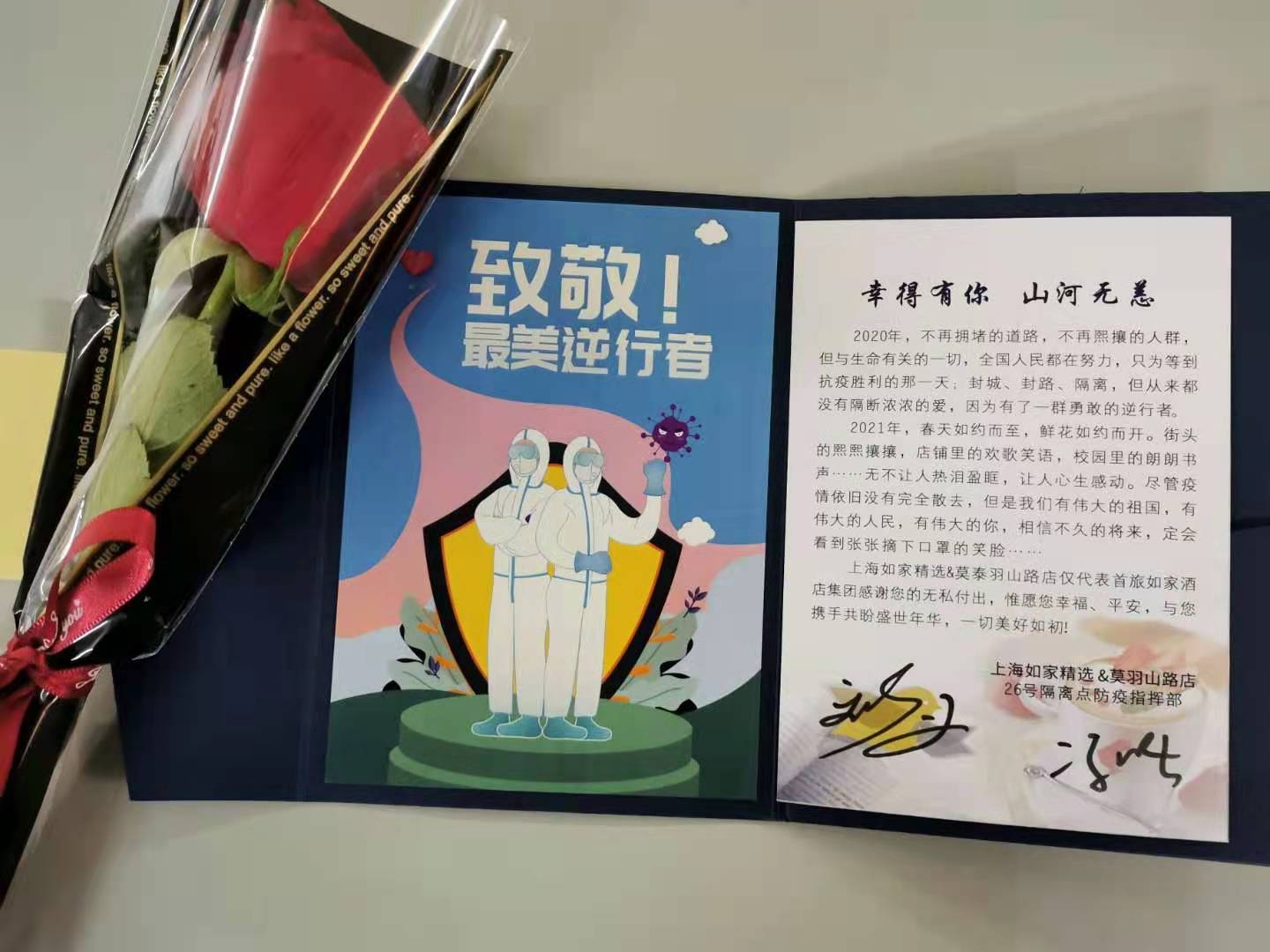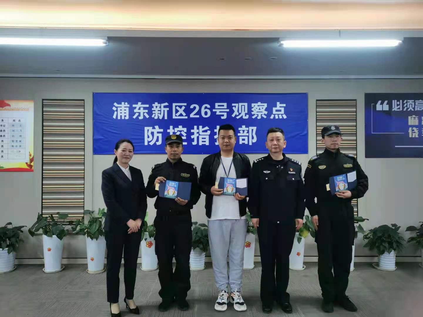 為紀(jì)念這一特別時(shí)刻,銘記這一特殊經(jīng)歷,疫情防控隔離的全體工勤人員進(jìn)行了合影留念。洋涇派出所領(lǐng)導(dǎo)為宗保公司參與26號(hào)疫情防控隔離點(diǎn)的員工代表頒發(fā)了紀(jì)念冊(cè),以表示對(duì)公司26號(hào)疫情防控隔離點(diǎn)服務(wù)保障員工的褒揚(yáng)和激勵(lì)。
