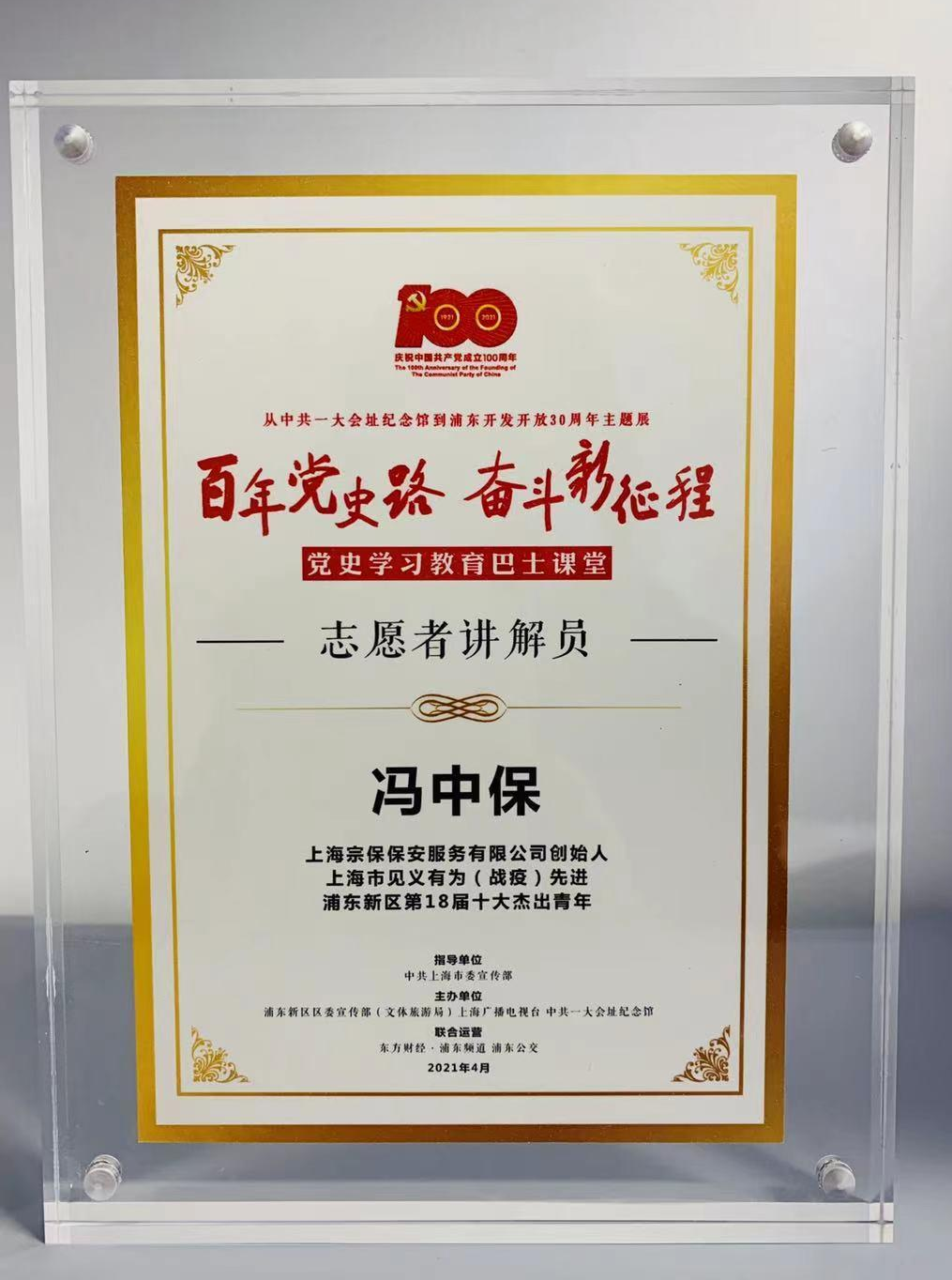 在發(fā)車儀式上,宗保公司創(chuàng)始人馮中保獲頒黨史巴士志愿講解員證書。