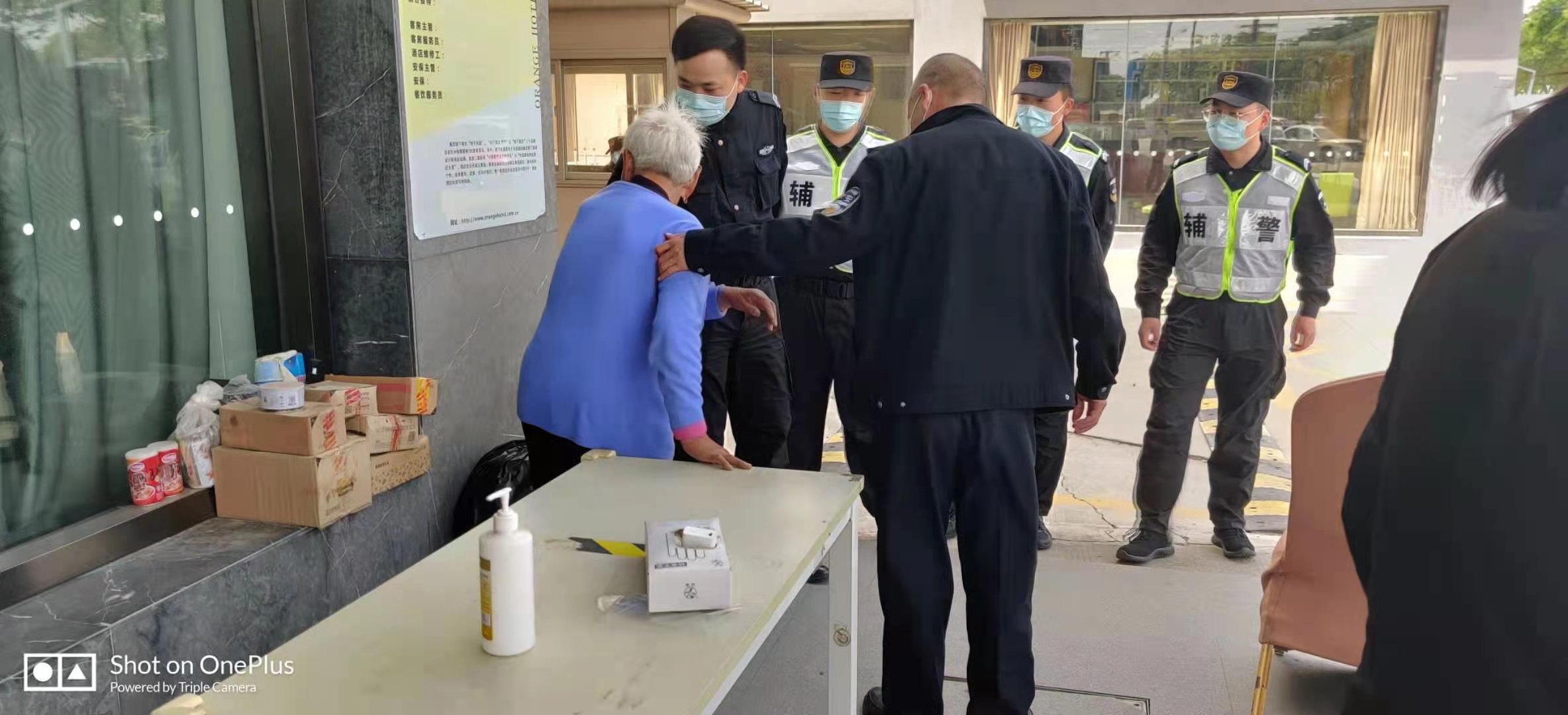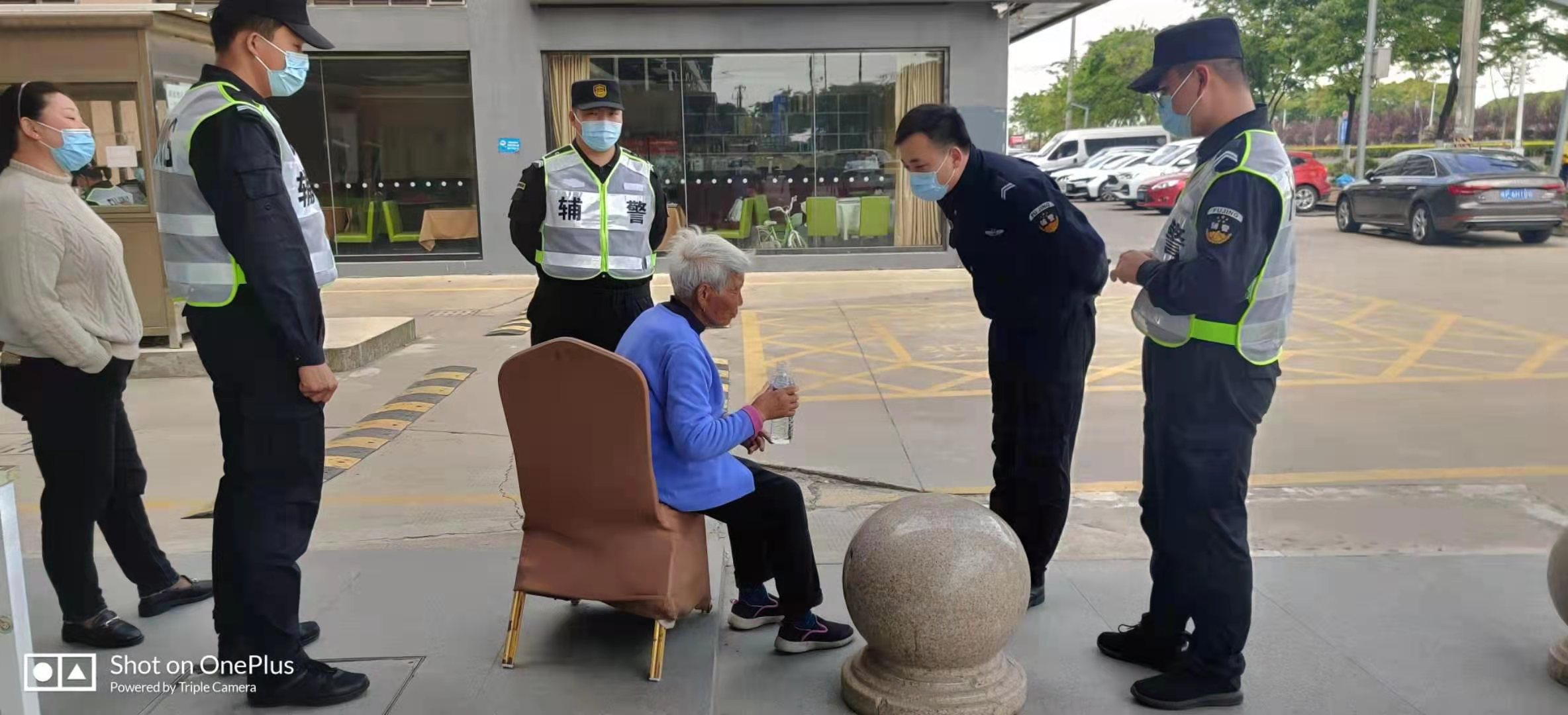 當(dāng)天12:30左右,隊員王震發(fā)現(xiàn)一位約八旬的老人在項目駐地門口來回徘徊,便上前詢問。因老人說方言,王震只大致聽懂老人是山西人,迷路找不到家了。見老人嘴唇干裂,年紀(jì)大身體虛弱,站立不穩(wěn),隊員唐振強(qiáng)趕緊扶住老人。同事高超趕緊搬來凳子,讓老人坐下休息,李文廣貼心地給老人端水。
