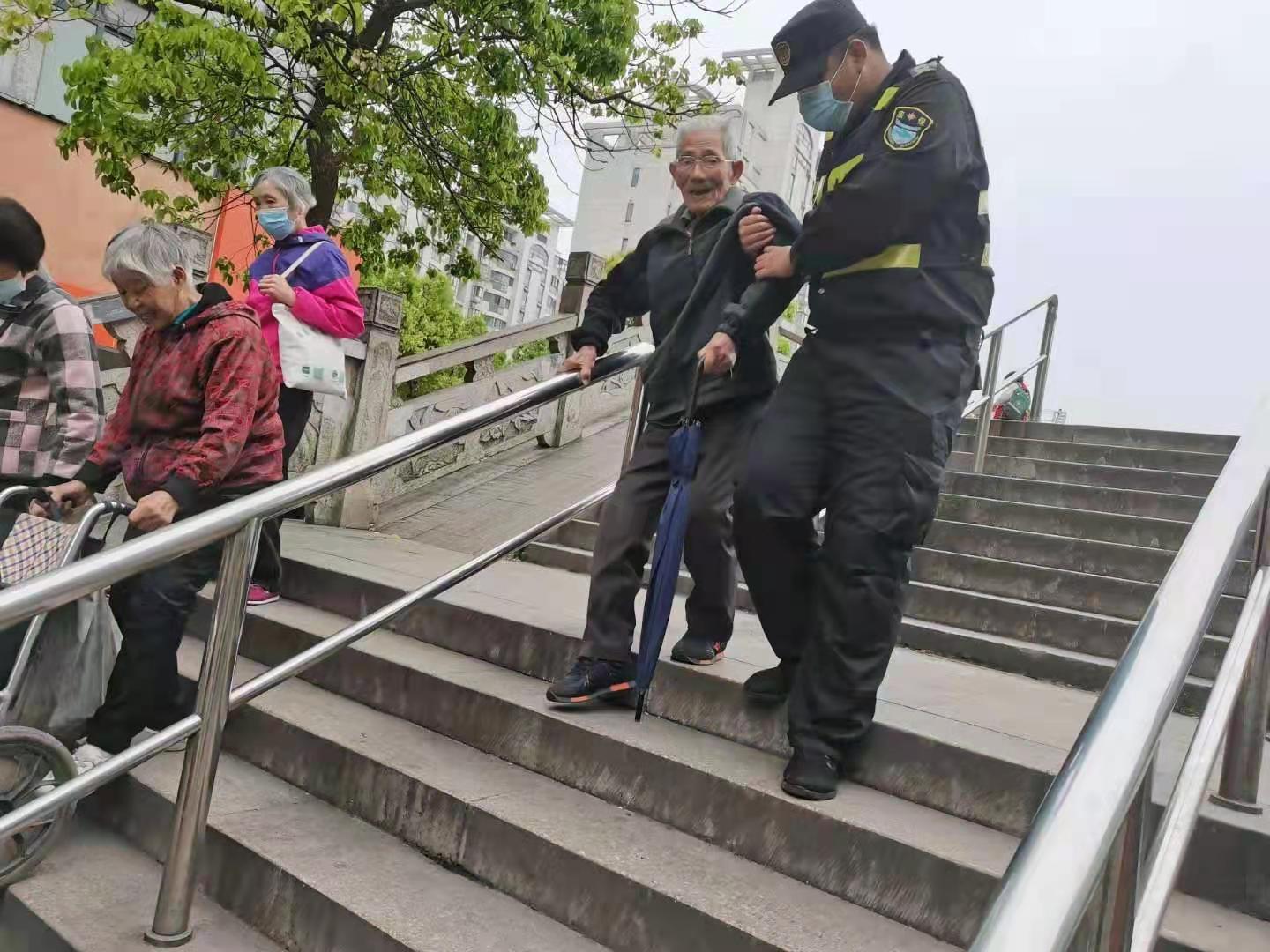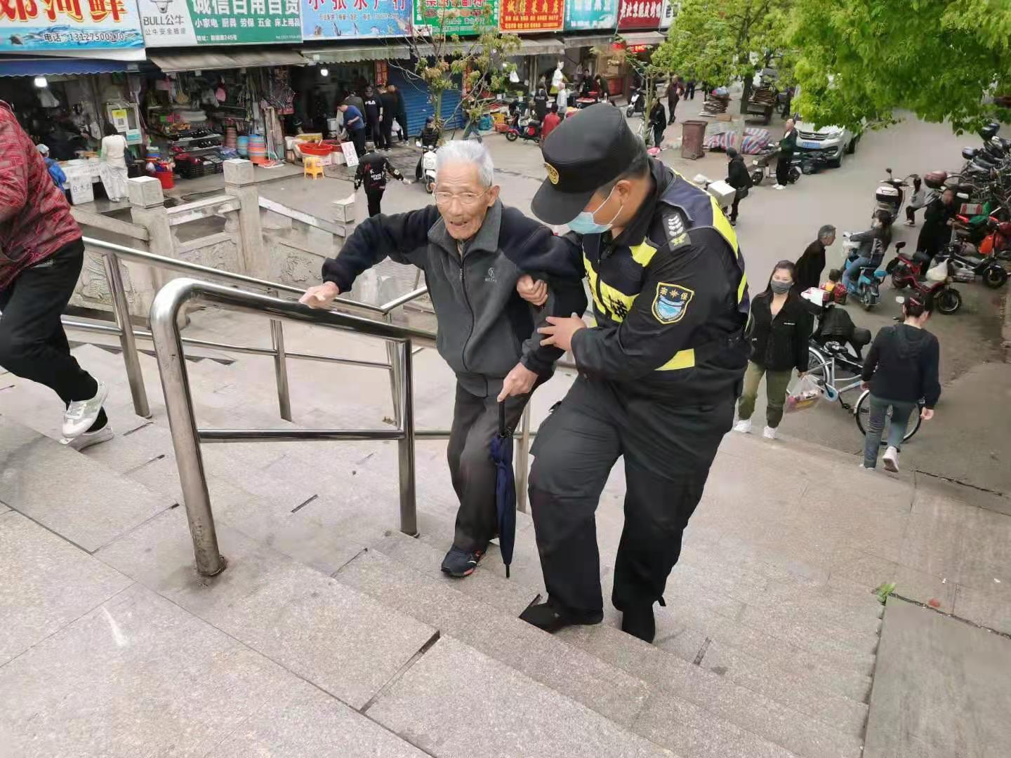 4月23日,宗保公司駐周浦市容項目隊員王楷迪,攙扶老人過天橋。
