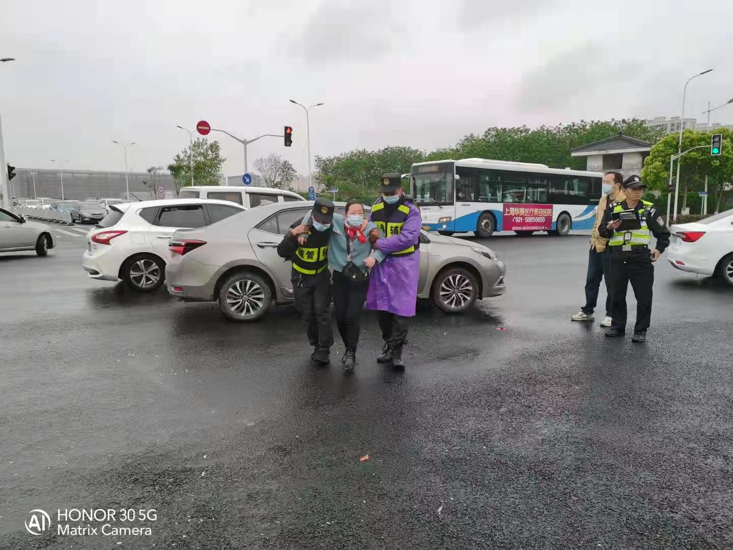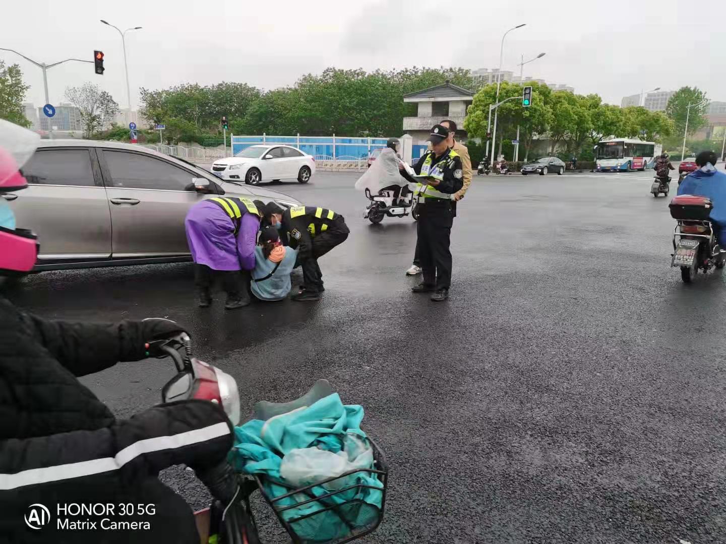 當(dāng)天8:02,彭勇、李來者在周園路繁榮東路路口巡邏時,在路口遇到一起交通事故,一輛小汽車將一輛電動車撞翻,一女子倒在路口中央,車主被嚇得站在一旁不知所措。兩人趕緊上前詢問傷者情況,被告知暫無大礙后,便扶其到路邊安全地帶。