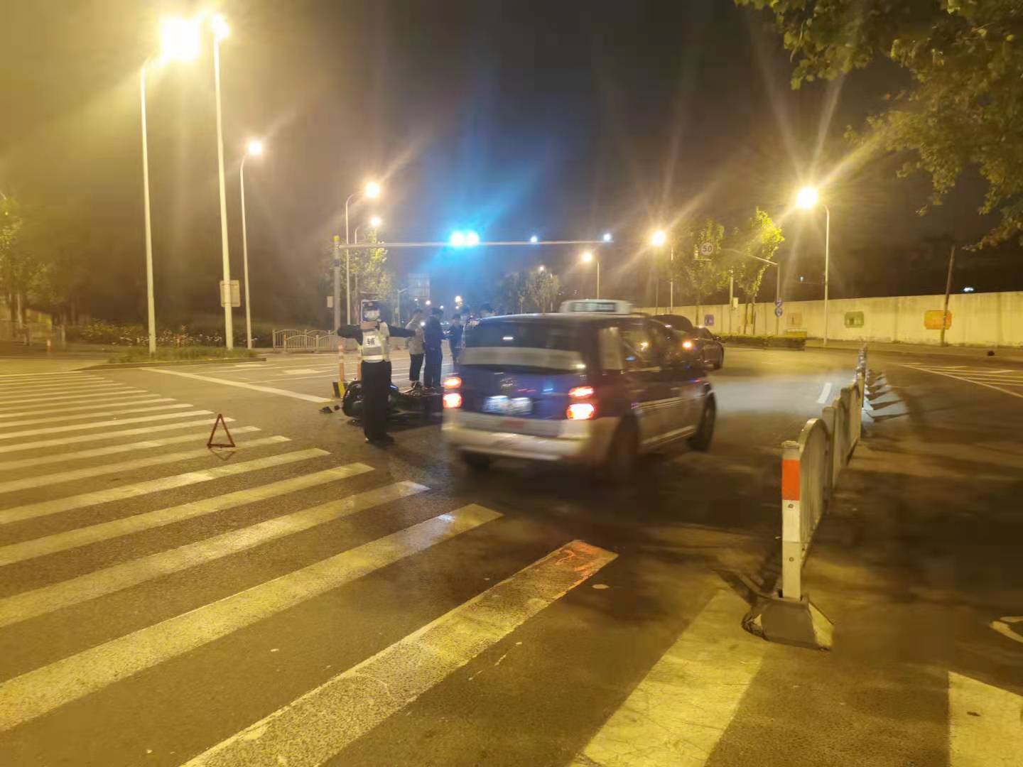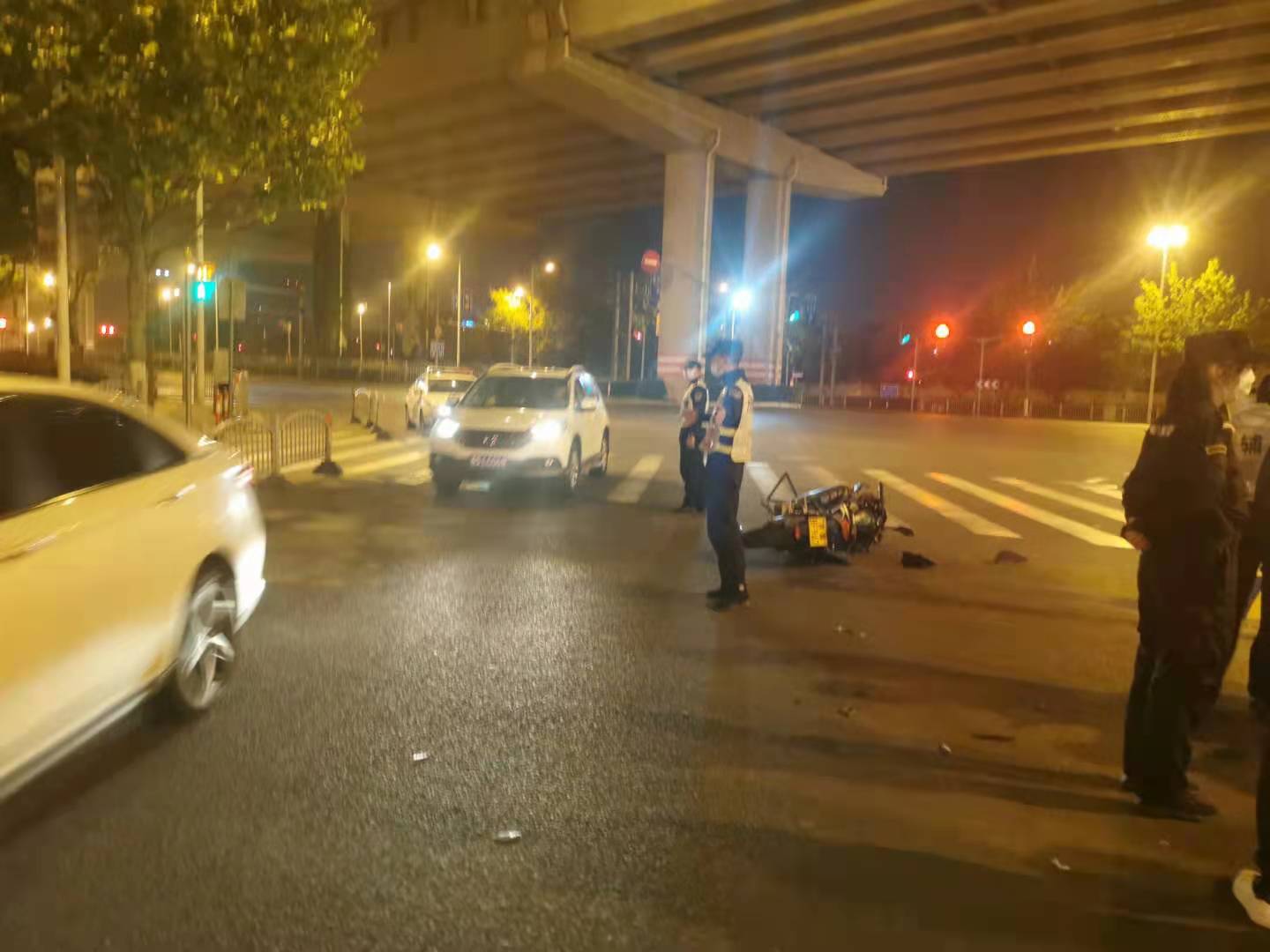 當天23:30,駐金橋派出所夜班巡邏隊員張港、賴作利巡邏至錦繡東路近金橋路時,發(fā)現(xiàn)前方路口發(fā)生交通事故,便立即上前查看,一摩托車駕駛員由于拐彎速度過快與對向正在行駛的一輛轎車相撞。