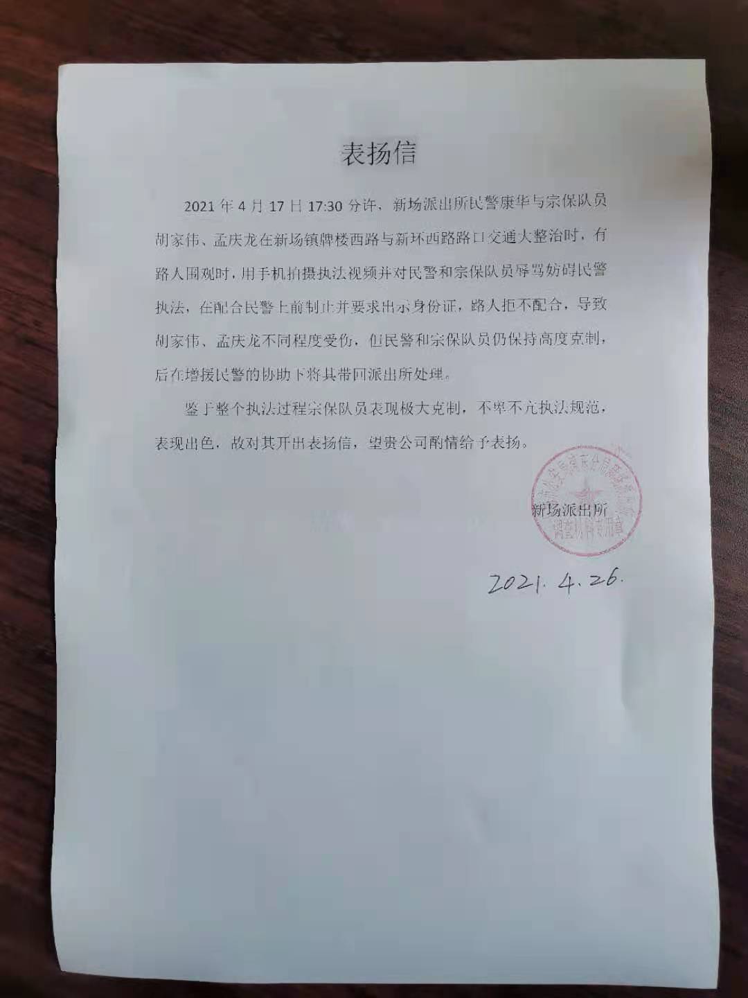 4月26號(hào),宗保公司駐新場(chǎng)輔警項(xiàng)目收到新場(chǎng)派出所送來(lái)的表?yè)P(yáng)信,信中對(duì)胡家偉、孟慶龍忍辱克制的優(yōu)秀表現(xiàn)提出表?yè)P(yáng)。