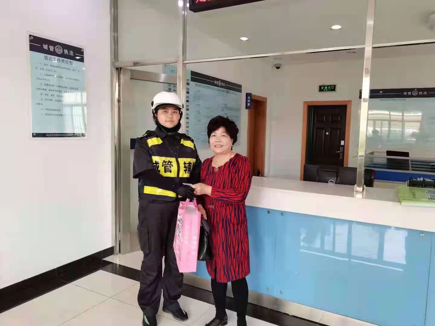 16:05左右,一位阿姨急匆匆趕來,好像是在尋找什么。曹秋霞見狀,主動上前詢問是不是丟了東西,阿姨說自己丟了一個手提袋,描述的袋內裝的東西和她撿到的東西一模一樣。確認阿姨是失主后,曹秋霞將阿姨帶到周浦城管中隊,把手提袋歸還給了阿姨。