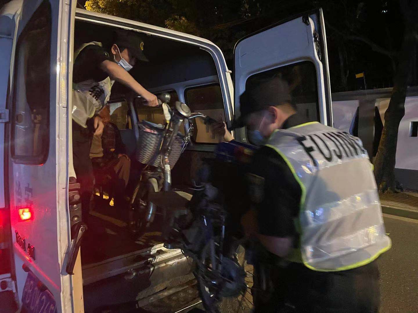 隨后,李景運(yùn)、梁秀樂、李榮恩合力把老爺爺?shù)碾娖寇囇b上車,王向?qū)⒗蠣敔敂v扶到車上,大家開車一起送老爺爺回家。