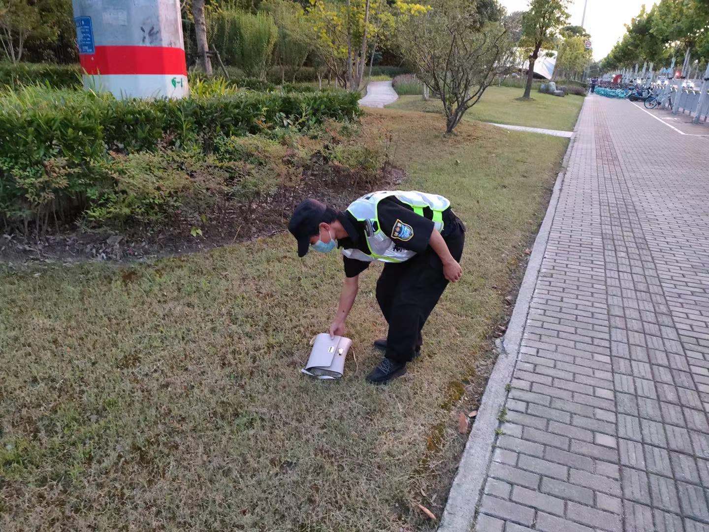 當(dāng)日18:35,楊徐在金吉路地鐵站2號(hào)口巡邏時(shí),在附近的草坪上撿到一個(gè)女士單肩包,現(xiàn)場(chǎng)拍照取證后及時(shí)上報(bào)當(dāng)班組長(zhǎng)。