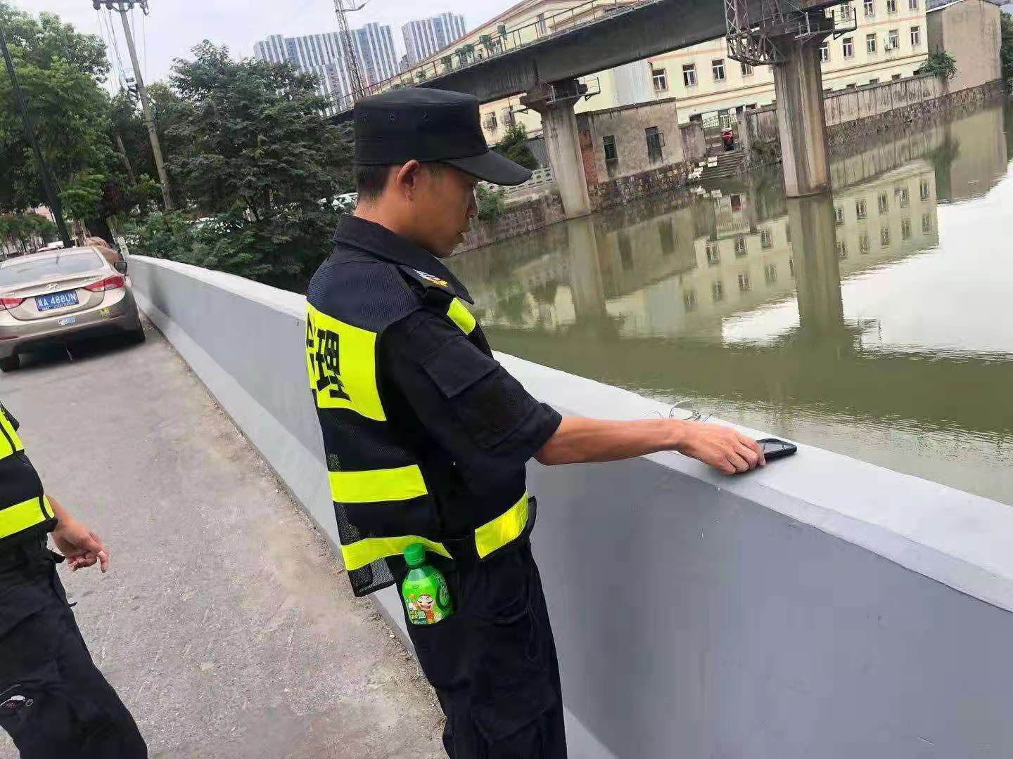 當(dāng)日8:40,趙云飛在新螺路巡邏時(shí),發(fā)現(xiàn)河邊的護(hù)欄上有一副眼鏡和一部手機(jī),但四周沒(méi)有人,便當(dāng)即上報(bào)項(xiàng)目負(fù)責(zé)人,并按指示在現(xiàn)場(chǎng)尋找失主。后來(lái),一男子打來(lái)電話尋找手機(jī)。