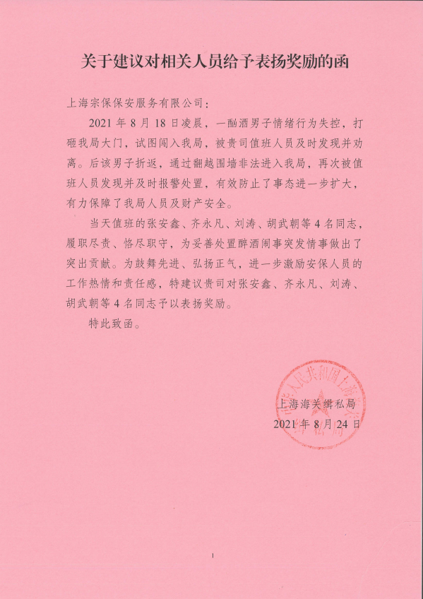 8月24日,上海海關(guān)緝私局給宗保公司駐上海海關(guān)緝私局項(xiàng)目送來一封建議表?yè)P(yáng)獎(jiǎng)勵(lì)的函,函中對(duì)公司工作警惕細(xì)致、恪盡職守的4名隊(duì)員提出特別表?yè)P(yáng)。