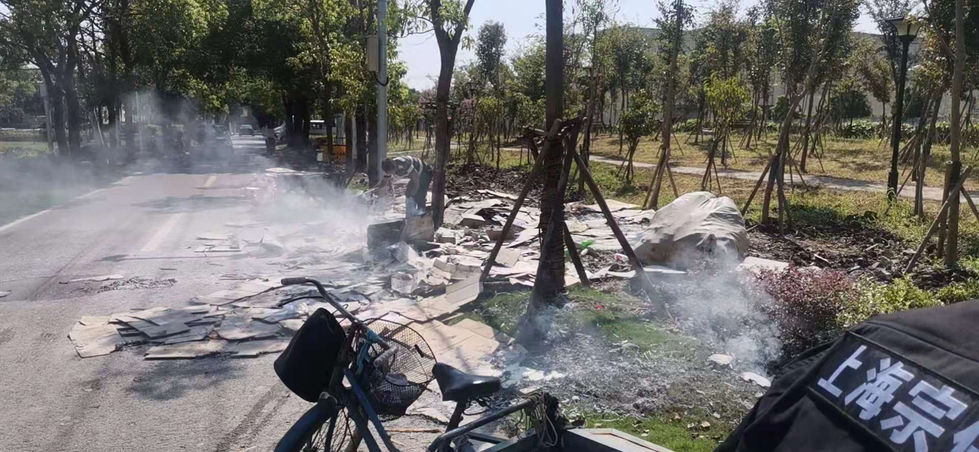 當(dāng)日9:26,界浜村消防站隊(duì)員在進(jìn)行訓(xùn)練時(shí),發(fā)現(xiàn)界浜村窯墩路上一輛行走的三輪車(chē)上的紙盒冒著黑煙,火苗直往上竄,而騎車(chē)的師傅沒(méi)有察覺(jué)。在這危急時(shí)刻,4名隊(duì)員馬上停止訓(xùn)練,帶上滅火器材奔到現(xiàn)場(chǎng),迅速展開(kāi)撲救。