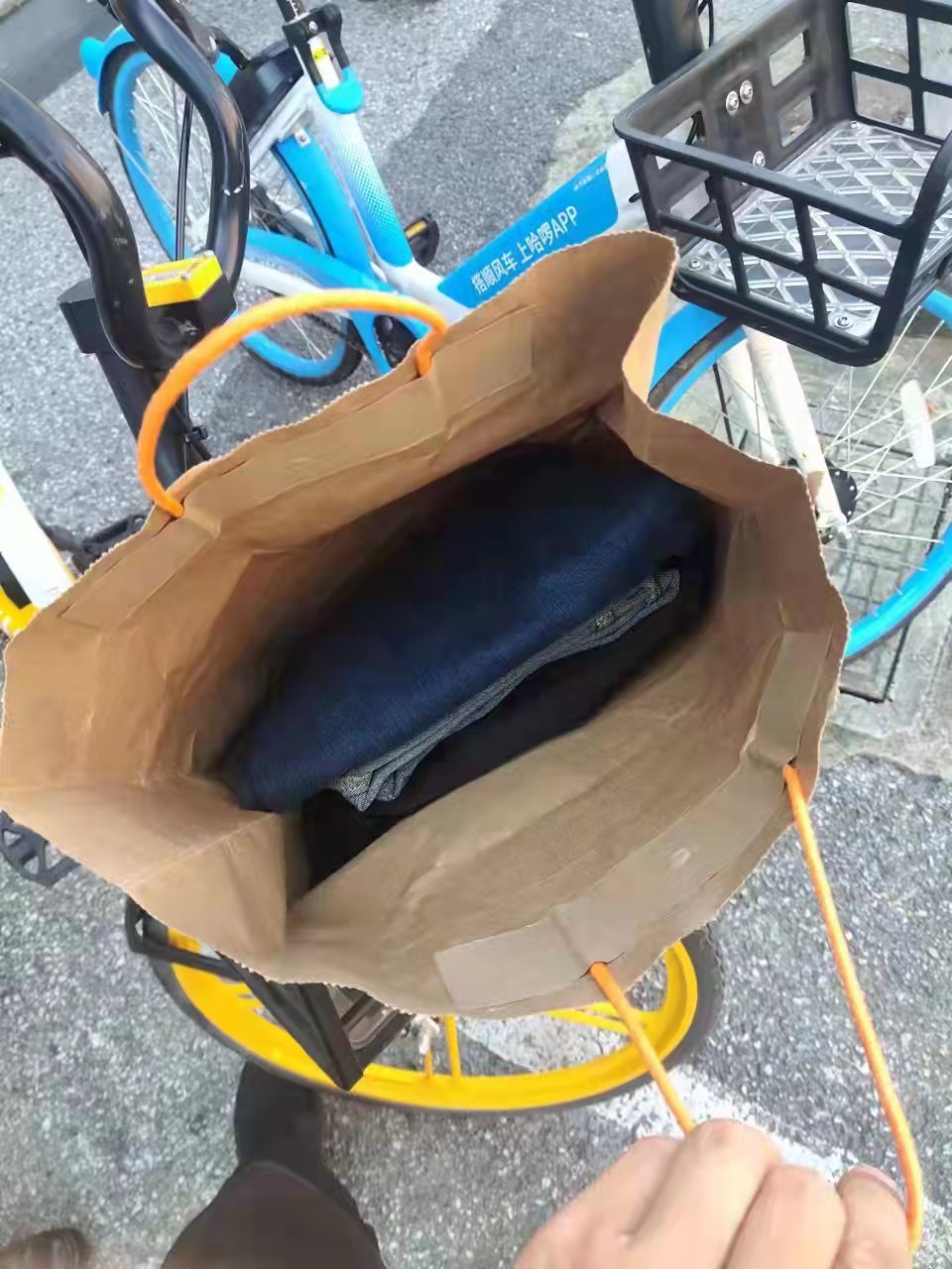當(dāng)天9:30,張陽巡邏到年家浜路康沈路路口時(shí),發(fā)現(xiàn)路邊一輛共享單車車筐里有一個(gè)袋子,周圍沒有人。