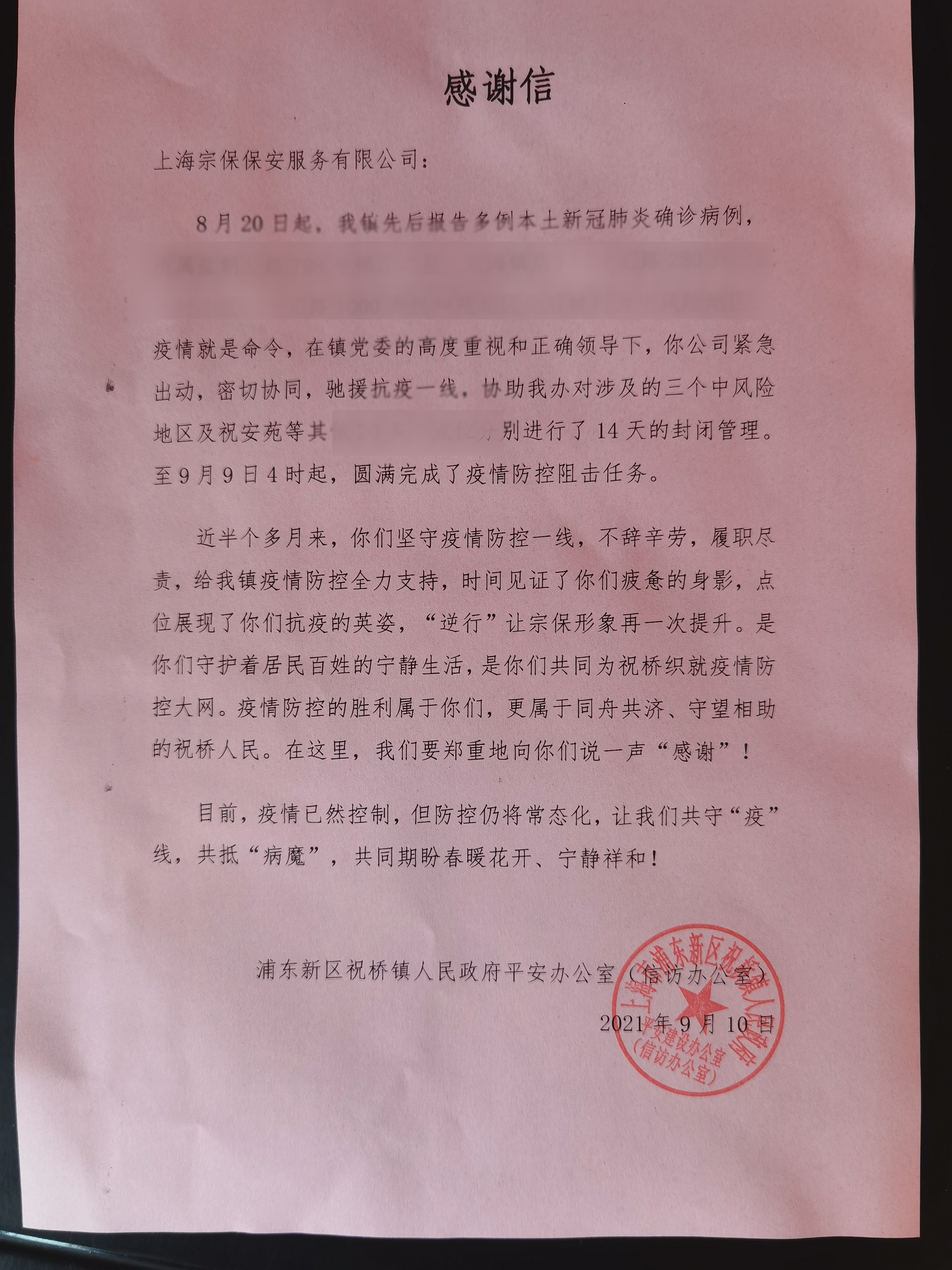 9月10日,宗保公司收到祝橋鎮(zhèn)平安辦送來的感謝信,獲贈祝橋鎮(zhèn)航城第一居民委員會繡有“服務(wù)居民抗疫情 助力社區(qū)勇?lián)?dāng)”的錦旗,感謝宗保公司在鎮(zhèn)疫情防控工作中所做的工作。
