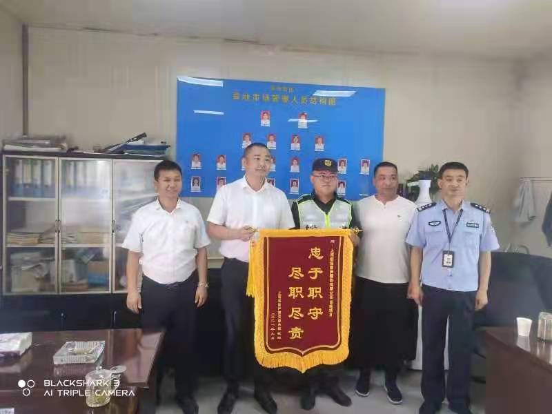 9月26日,宗保公司駐三林喜地農(nóng)貿(mào)市場項目收到喜地農(nóng)貿(mào)市場贈送的一面繡有“忠于職守 盡職盡責(zé)”的錦旗,表揚(yáng)宗保隊員趙海亮、李占軍機(jī)智果敢的行為表現(xiàn)。