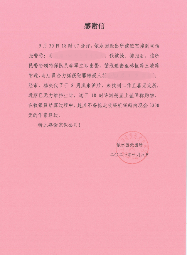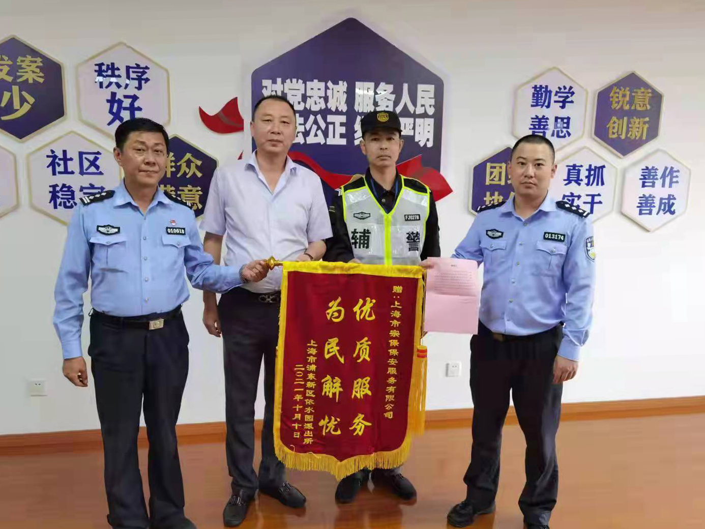 10月15日,浦東新區(qū)依水園派出所副所長張嘯天和民警錢堅(jiān)強(qiáng)將一面繡有“優(yōu)質(zhì)服務(wù) 為民解憂”的錦旗和一封感謝信,送到宗保公司副總經(jīng)理王耀和隊(duì)員李軍的手上,表揚(yáng)宗保隊(duì)員李軍在抓獲犯罪嫌疑人中機(jī)智果敢的行為。