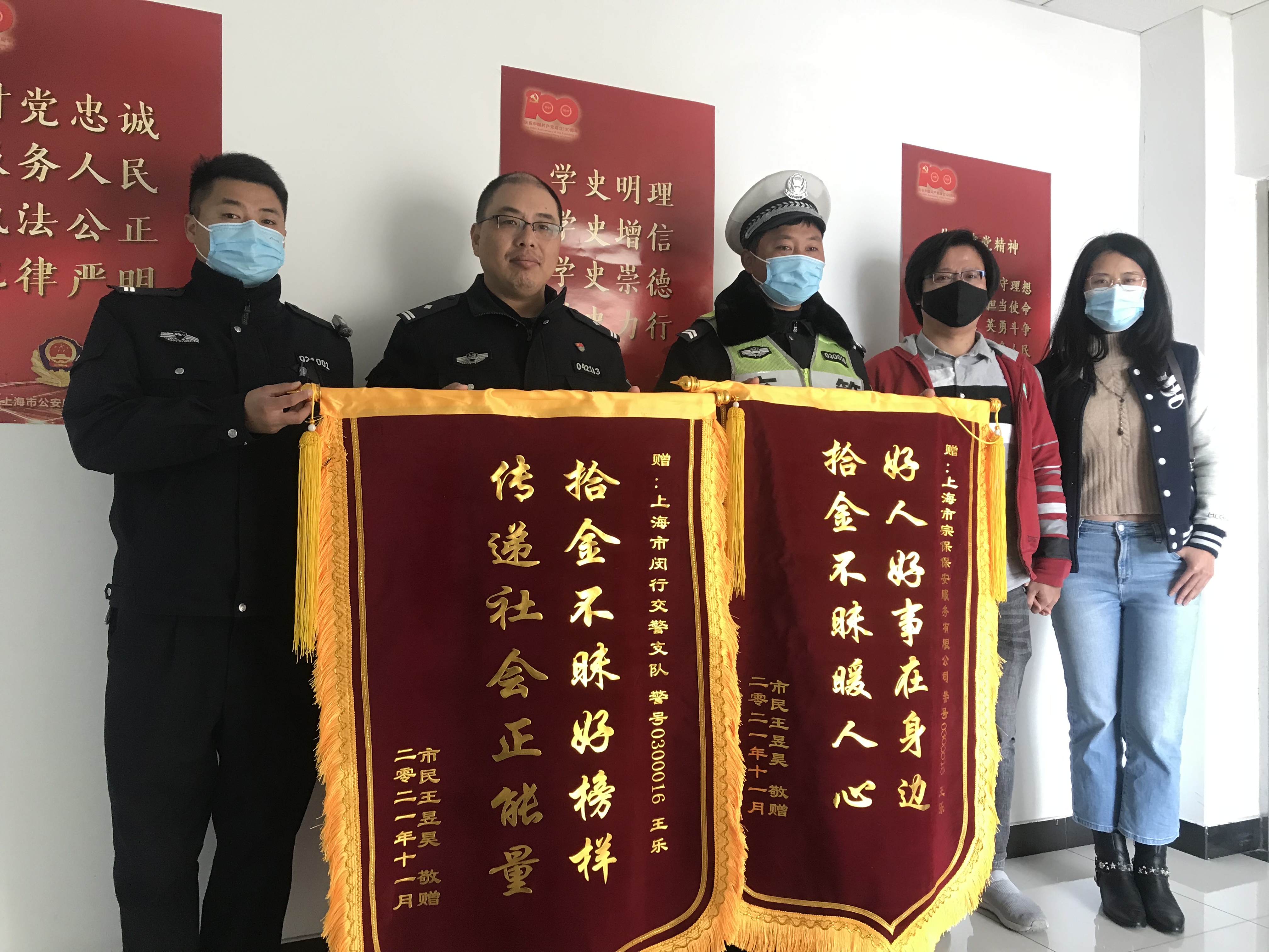12月1日,宗保公司駐閔行交通委項(xiàng)目隊(duì)員王樂收到市民王先生送來的繡有“拾金不昧好榜樣 傳遞社會(huì)正能量”“好人好事在身邊 拾金不昧暖人心”的錦旗,稱贊他拾金不昧的行為。