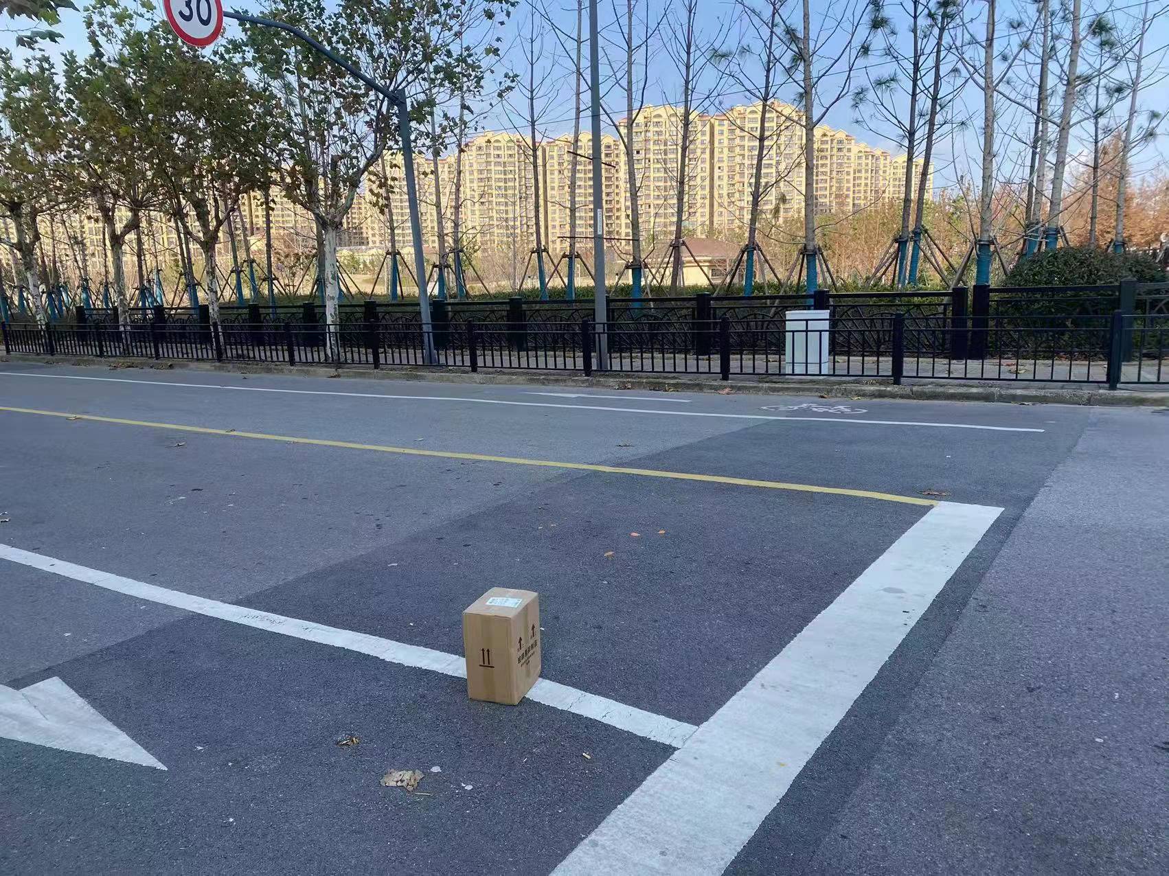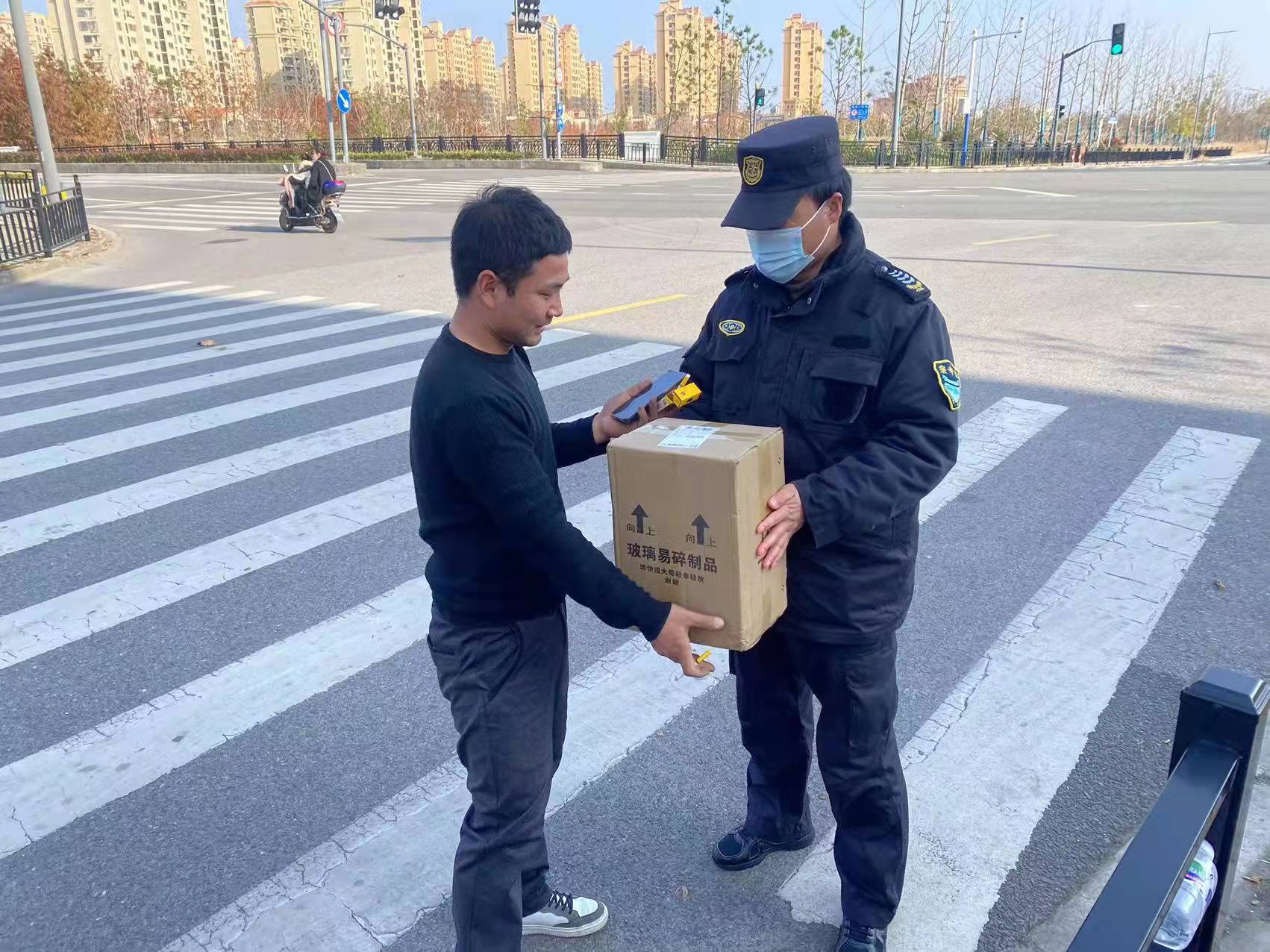 兩人見此情況,趕忙跑過去將紙箱移至馬路邊,把情況上報(bào)項(xiàng)目負(fù)責(zé)人。隨后,白躍濤通過掃描訂單上的二維碼,獲取到快遞小哥的電話號(hào)碼,聯(lián)系上快遞小哥,與他約好碰面時(shí)間地點(diǎn)。