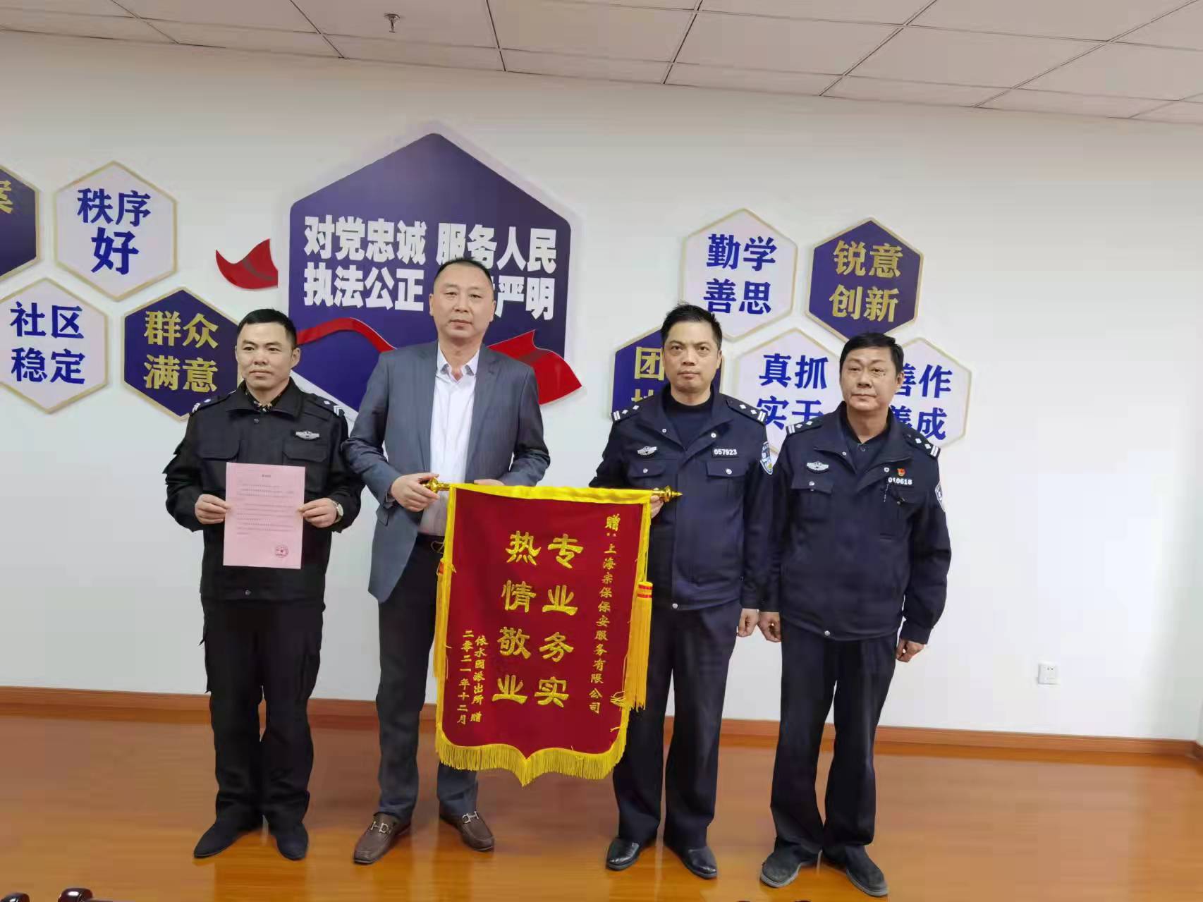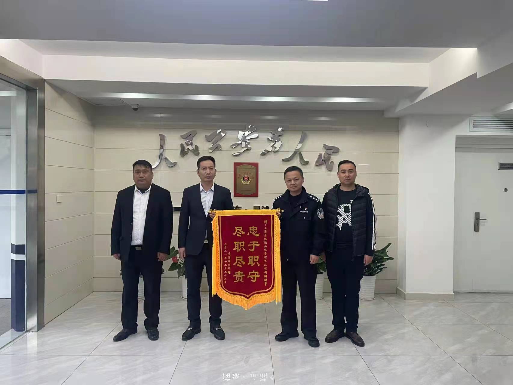 12月25日,宗保公司駐周浦輔警項目收到周浦派出所送來的一面繡有“忠于職守 盡職盡責”的錦旗,感謝宗保隊員良好的工作表現。