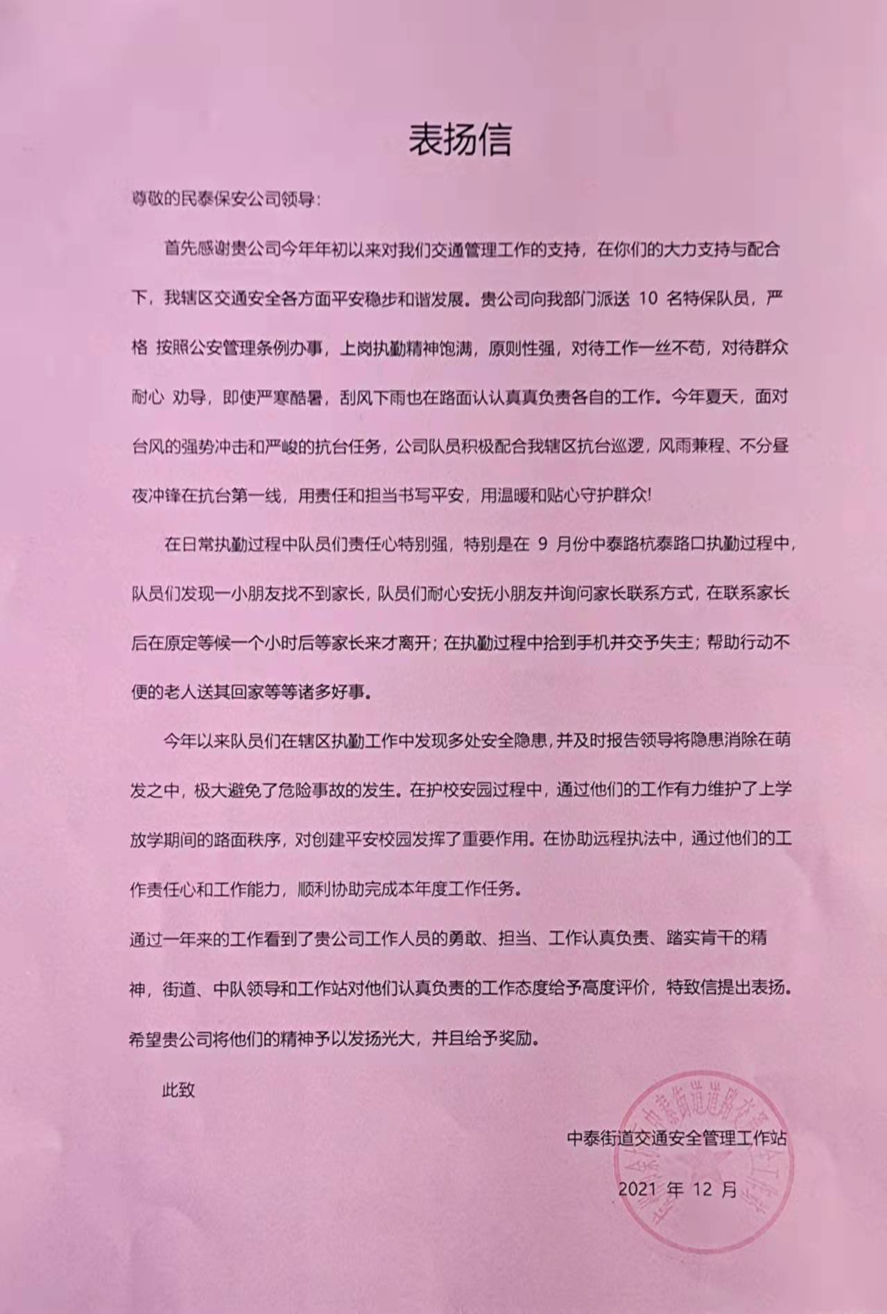 12月28日,浙江民泰公司駐中泰交管輔助項目收到余杭區(qū)中泰街道交警工作站站長王平、指導員應海松的表揚信,表揚民泰員工盡心履職突出的工作表現。