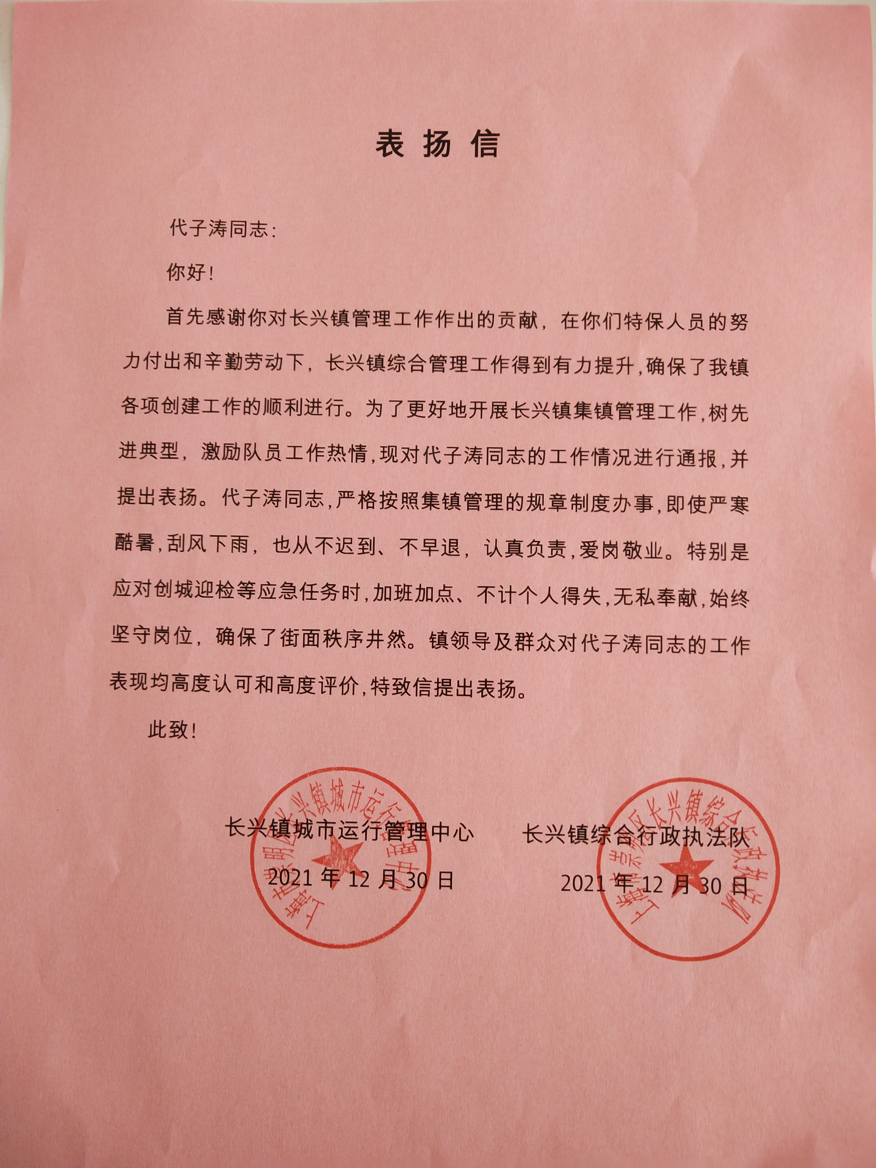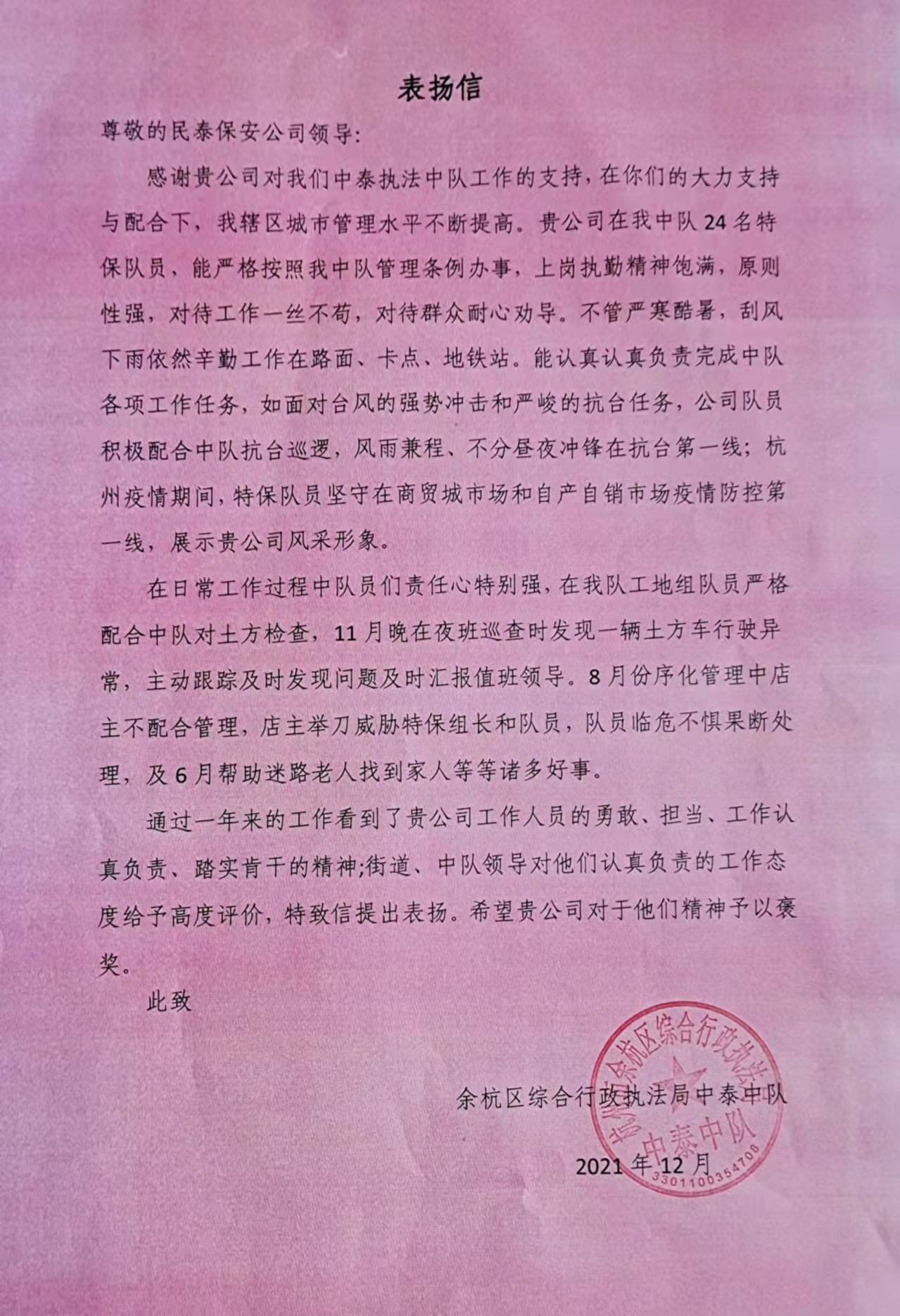 12月29日,浙江民泰駐中泰城管輔助項目收到余杭區(qū)中泰街道城管中隊副中隊長王哲送來的表揚信,信中對民泰隊員履職盡責的工作表現予以表揚。