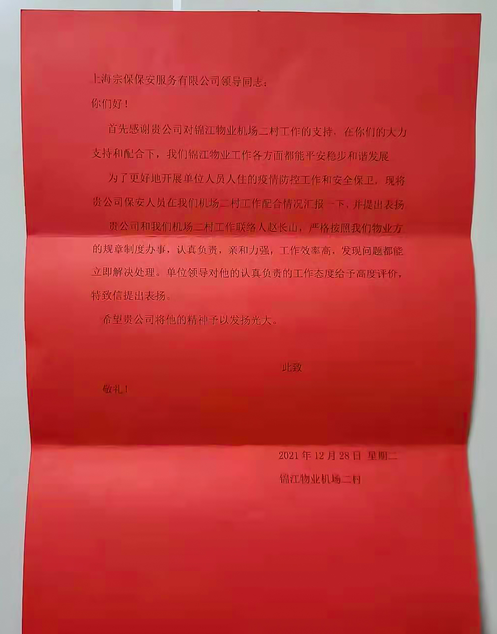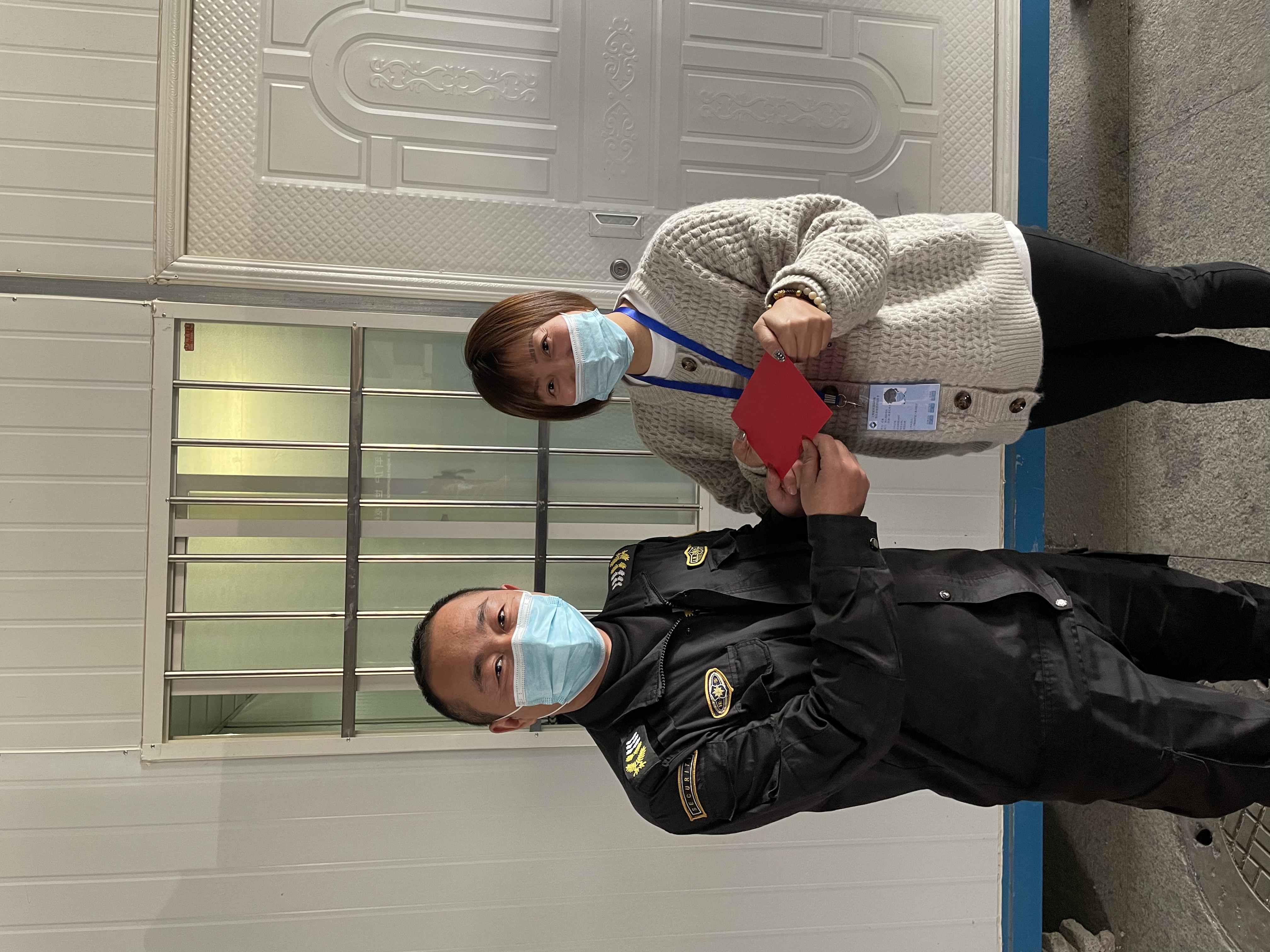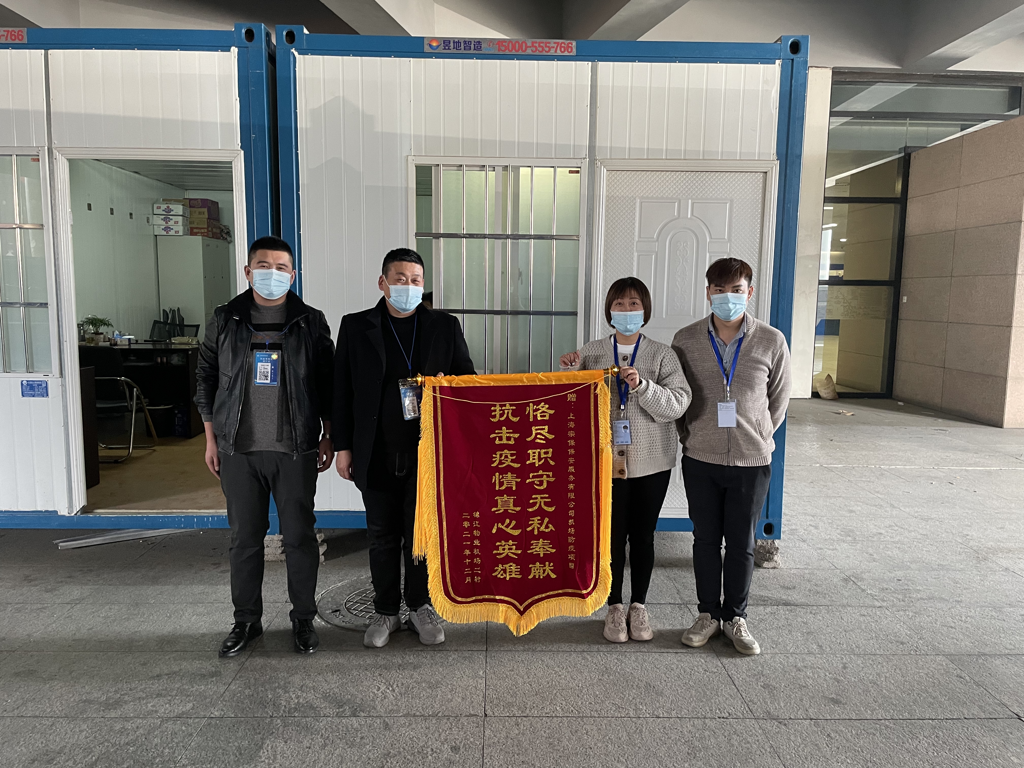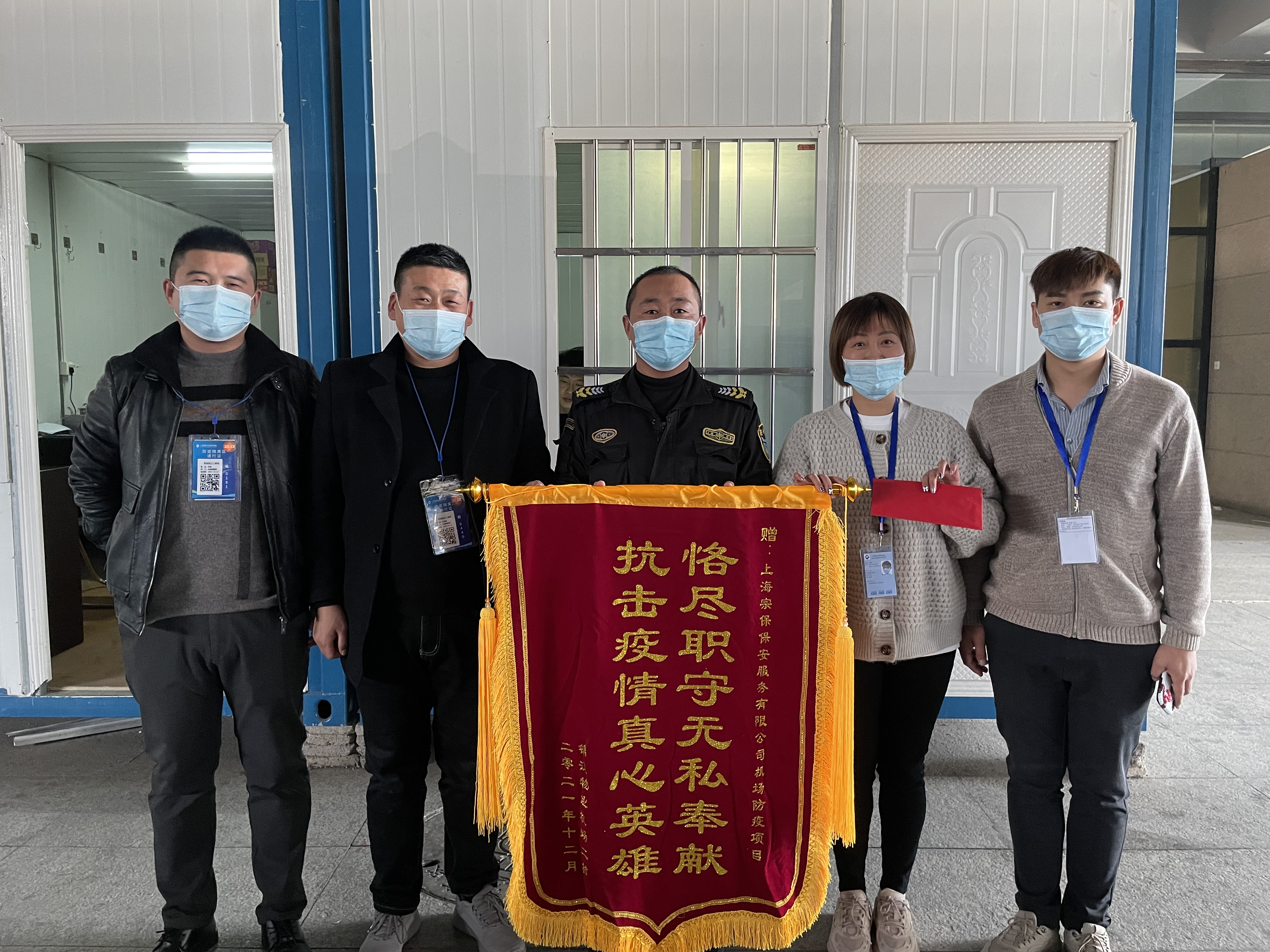 12月31日,錦江物業(yè)機場二村經理莊敏和辦公室總監(jiān)孟銀行,將繡有“恪盡職守無私奉獻 抗擊疫情真心英雄”的錦旗和表揚信送到宗保公司機場防疫項目,感謝宗保公司對其工作的大力支持,表揚隊員趙長山突出的工作表現。