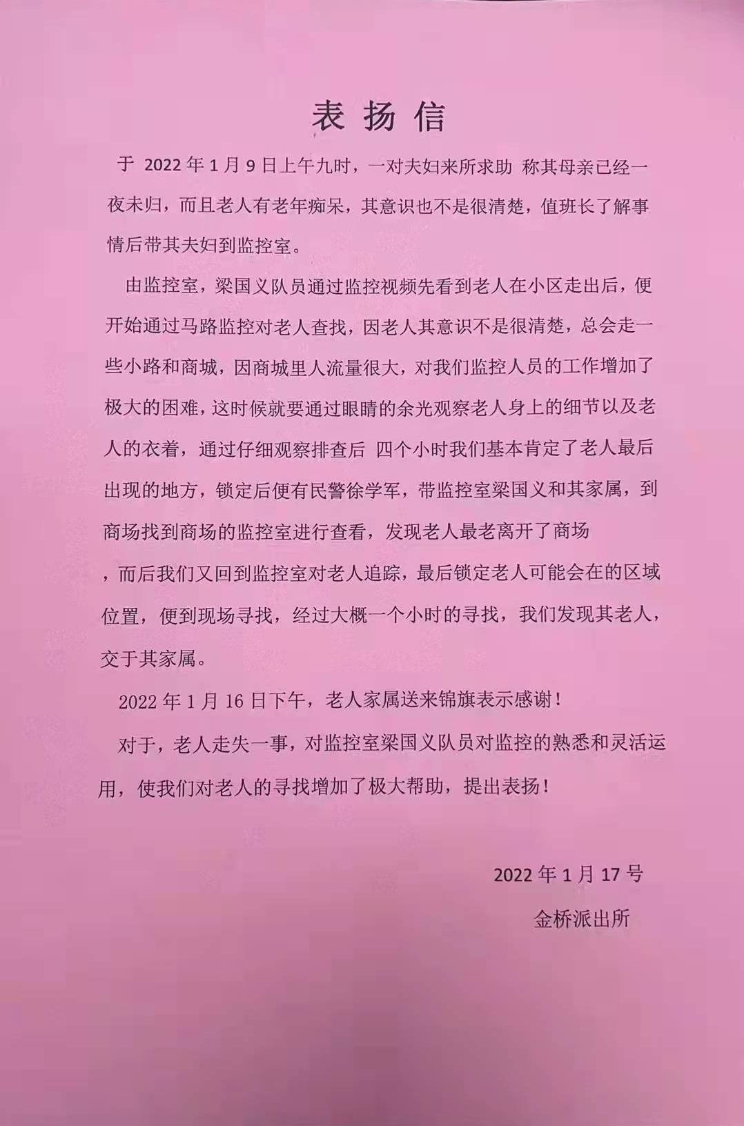 1月17日,宗保公司駐金橋輔警項(xiàng)目收到金橋派出所的表揚(yáng)信,表揚(yáng)宗保隊(duì)員助力市民秦先生找到其走失母親的良好工作表現(xiàn)。