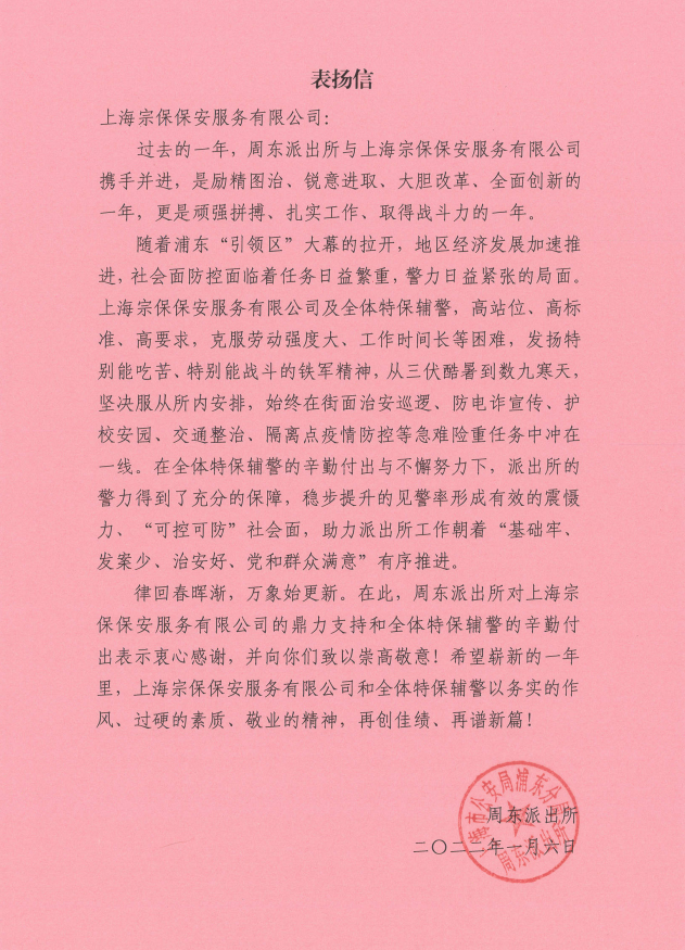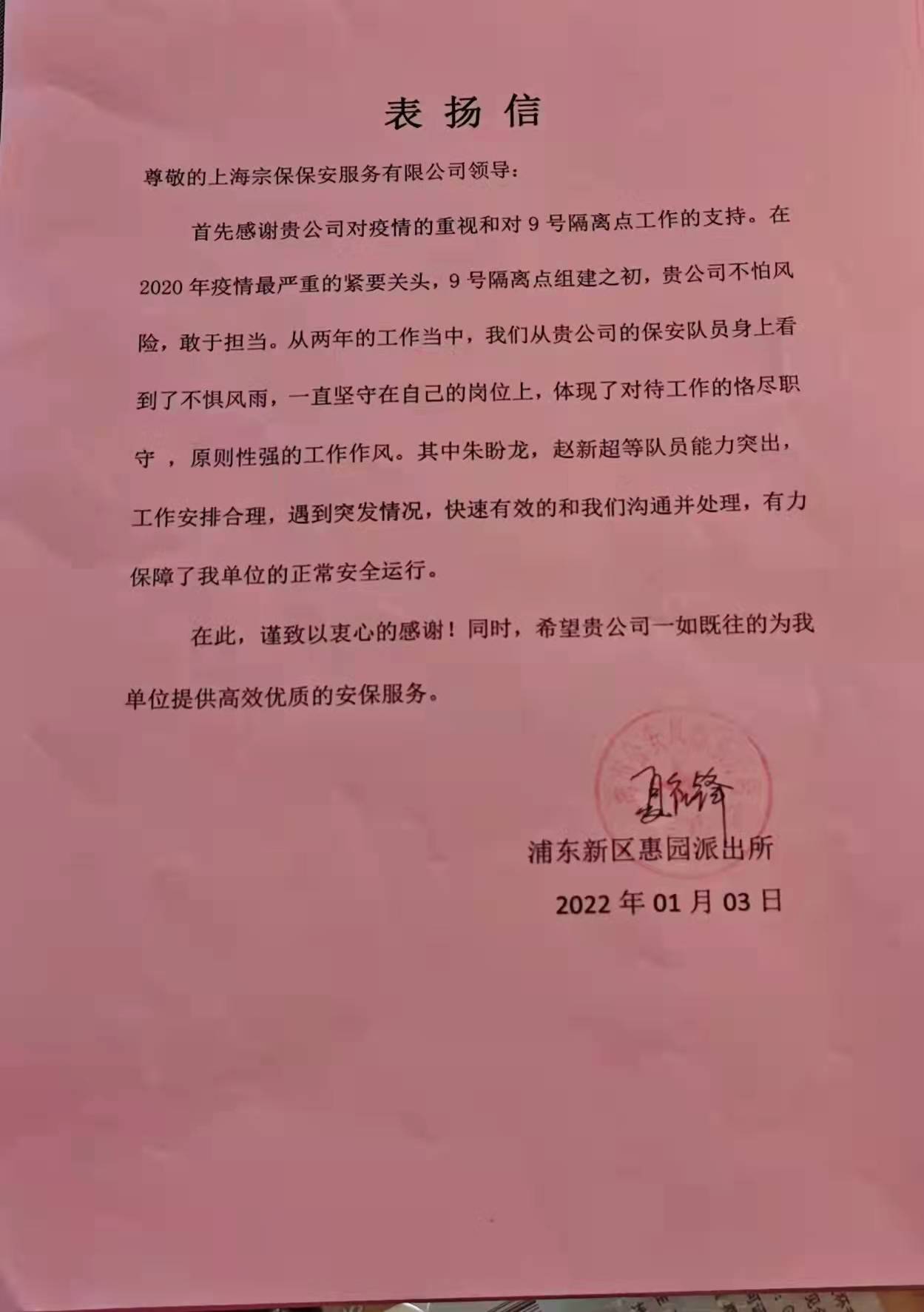 1月3日,宗保公司駐9號疫情防控隔離點(diǎn)項(xiàng)目收到浦東新區(qū)惠園派出所的表揚(yáng)信,信中表揚(yáng)宗保公司員工突出的工作表現(xiàn),感謝宗保公司對其工作的大力支持。