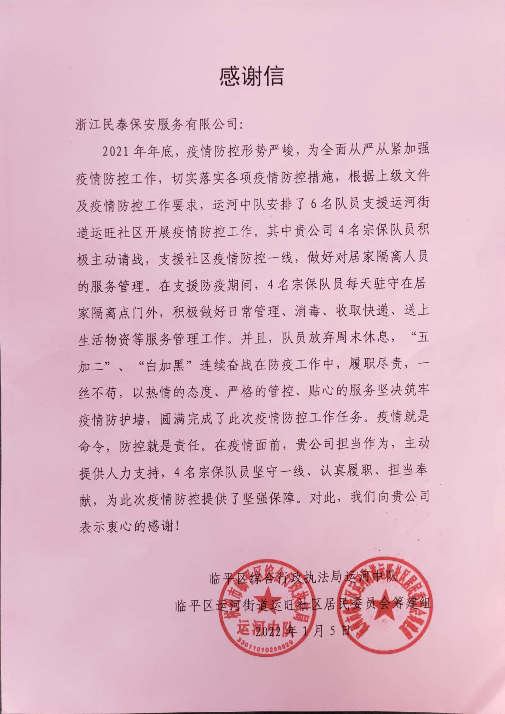 1月11日,浙江民泰駐運(yùn)河市容項(xiàng)目收到臨平區(qū)綜合行政執(zhí)法局運(yùn)河中隊(duì)和運(yùn)河街道運(yùn)旺社區(qū)居民委員會籌建組送來的感謝信,感謝公司對社區(qū)疫情防控工作的大力支持。