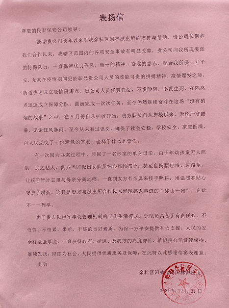 1月12日,民泰公司駐閑林輔警項(xiàng)目收到閑林派出所的表揚(yáng)信,信中表揚(yáng)民泰隊(duì)員出色的工作表現(xiàn)。