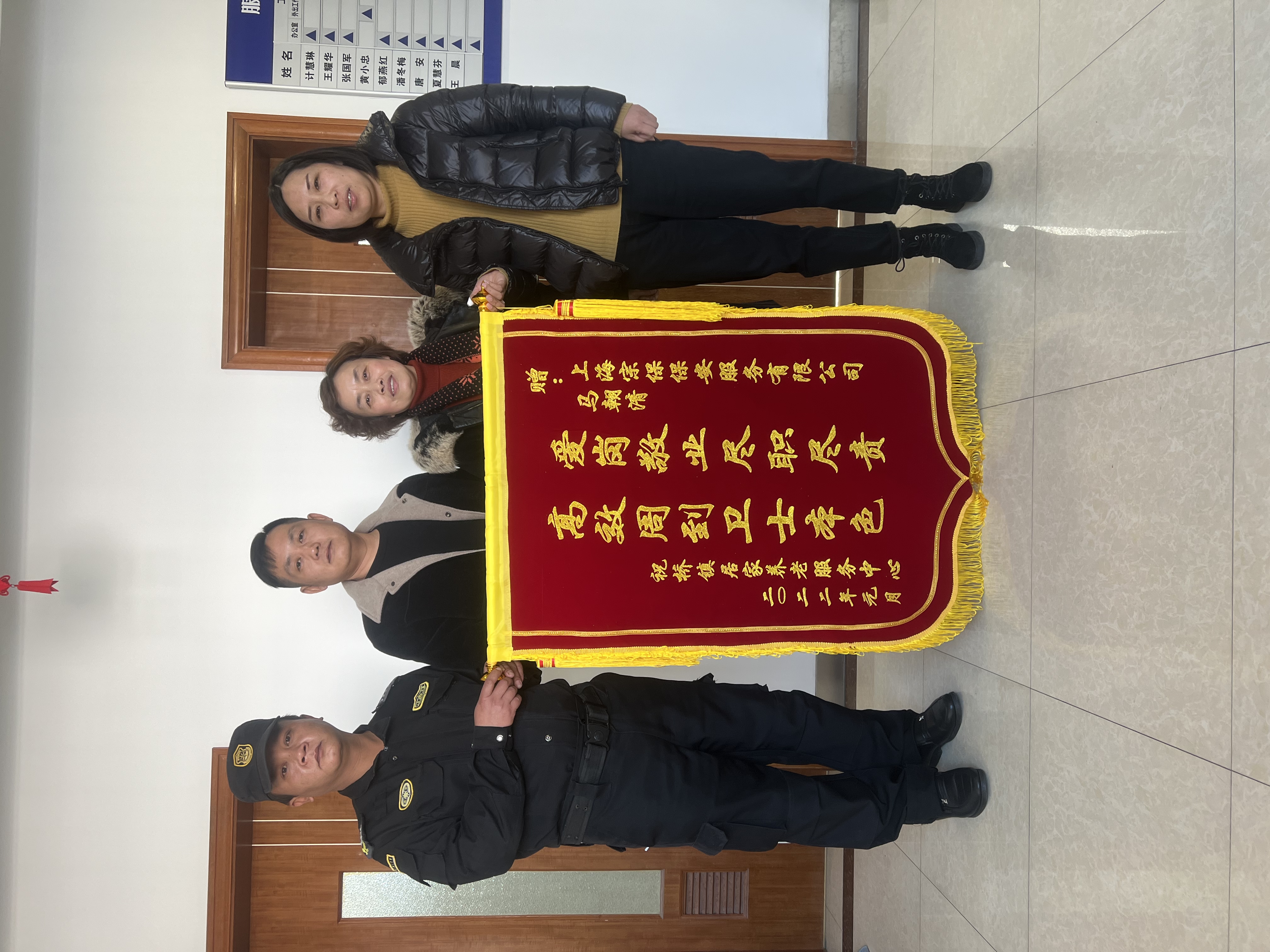 1月12日,宗保公司駐祝橋項(xiàng)目收到祝橋鎮(zhèn)居家養(yǎng)老服務(wù)中心送來的繡有“愛崗敬業(yè)盡職盡責(zé) 高效周到衛(wèi)士本色”的錦旗,贊揚(yáng)宗保隊(duì)員馬朝清優(yōu)異的工作表現(xiàn)。