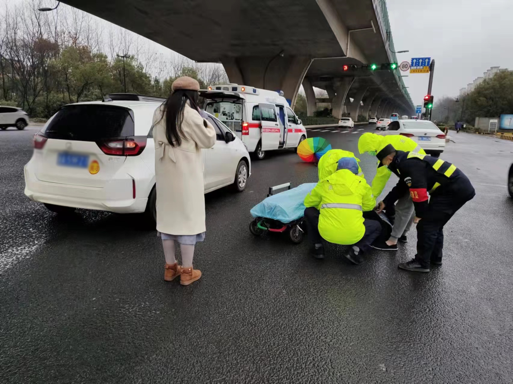 當(dāng)日9:20,宋亭、呂劍強(qiáng)在天目山路良睦路口巡邏時(shí),發(fā)現(xiàn)前方路口發(fā)生交通事故,便立即上前查看,一輛行駛的轎車將行人撞到在地,受傷女子躺在馬路中間。