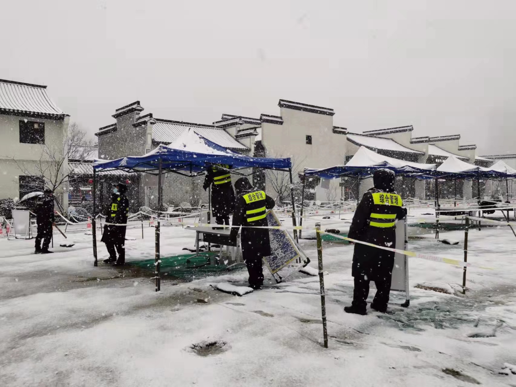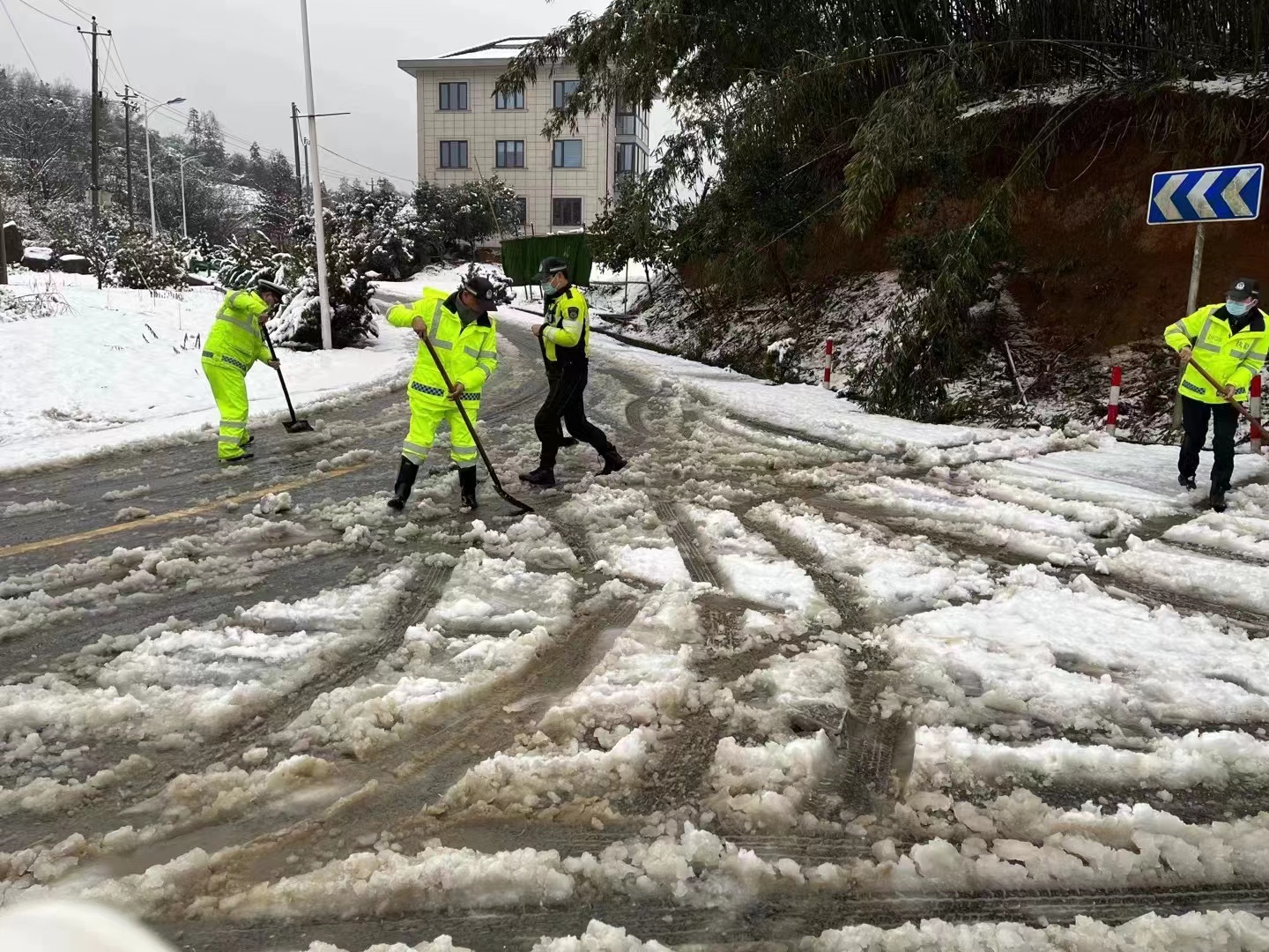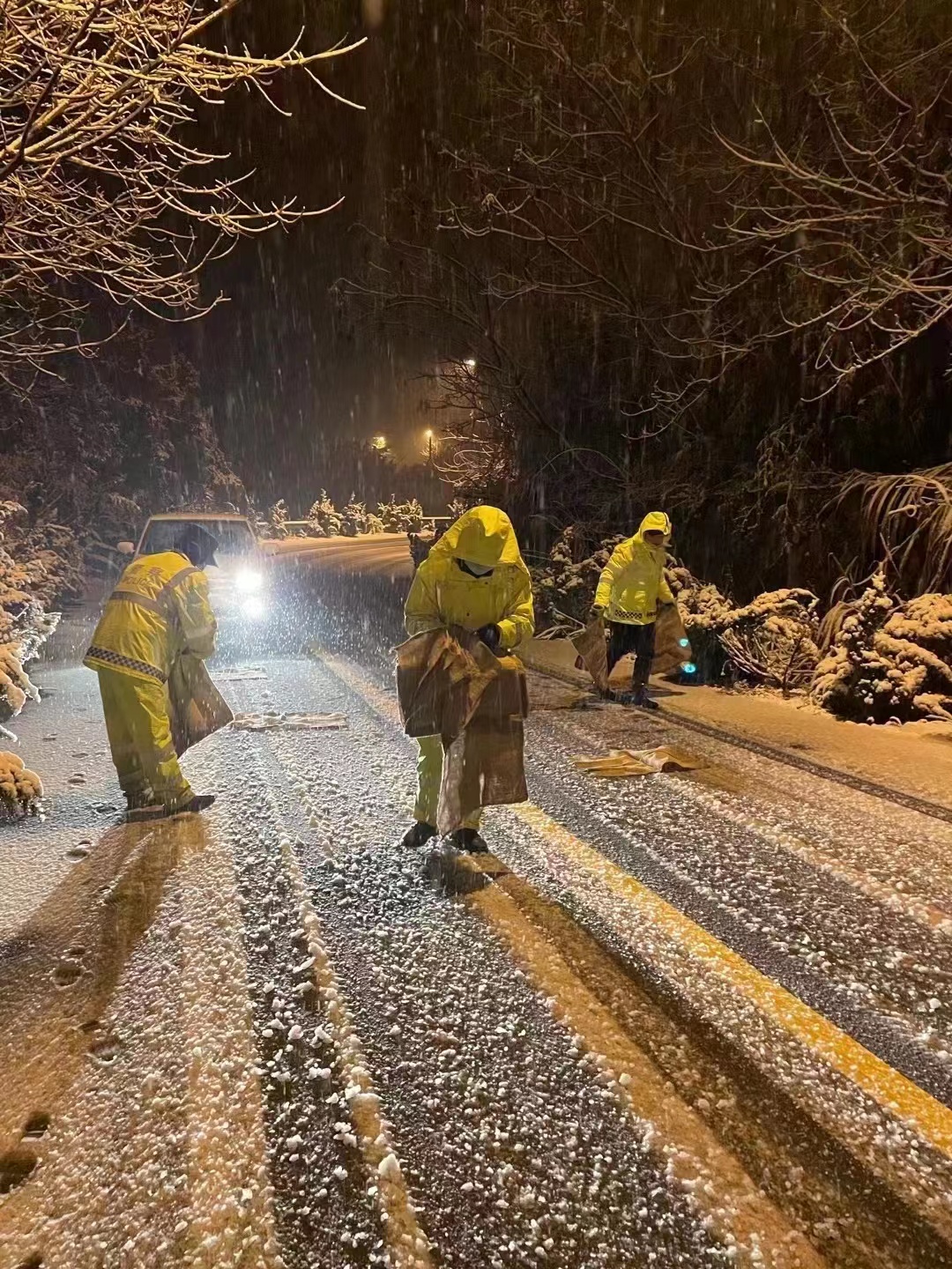 隊(duì)員們頂著寒風(fēng),不畏嚴(yán)寒,齊心協(xié)力,相互配合,揮舞著鐵锨、掃把等工具,對(duì)重點(diǎn)場(chǎng)所主要出入口、鎮(zhèn)區(qū)主干道、人行道等區(qū)域的積雪進(jìn)行清理;在上山傾斜路段開展撒鹽化雪、鋪草墊、除路障、設(shè)置醒目防滑標(biāo)志、幫助因雪受困車輛脫困等工作……直至凌晨一點(diǎn)清雪除冰工作才暫時(shí)告一段落。