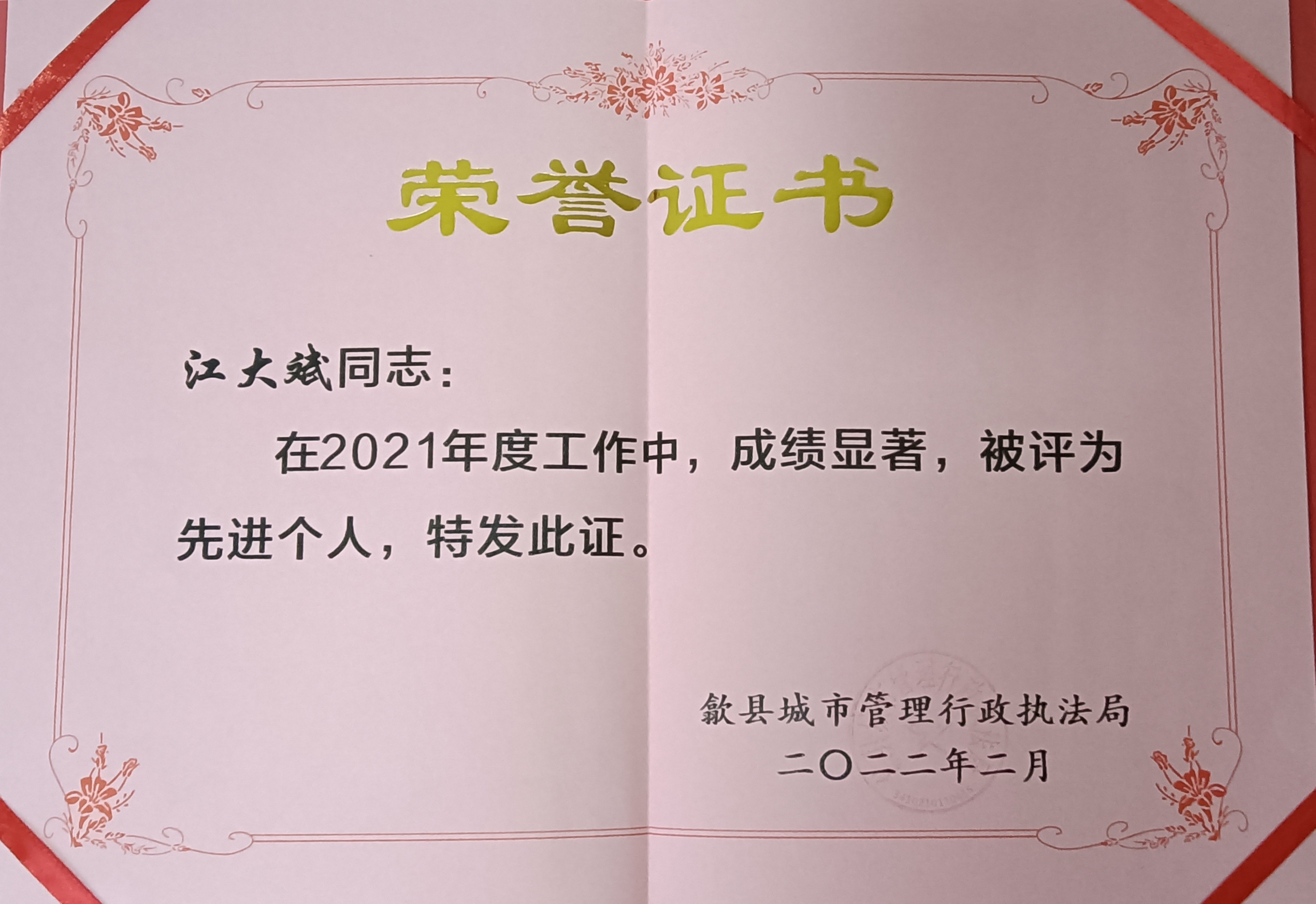 2022年2月14日,歙縣城管執(zhí)法局召開(kāi)城市管理工作會(huì)議。公司駐歙縣市容項(xiàng)目隊(duì)被歙縣城市管理行政執(zhí)法局評(píng)為“2021年度先進(jìn)集體”,項(xiàng)目隊(duì)員江大斌、陳秋雨被評(píng)為“先進(jìn)個(gè)人”。