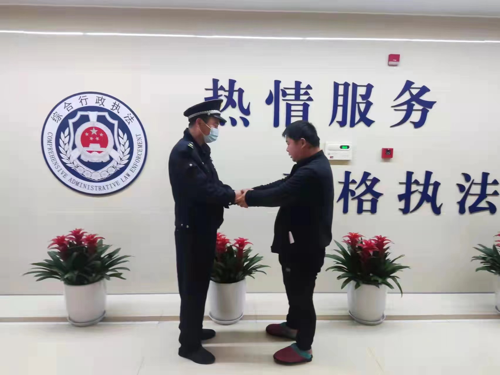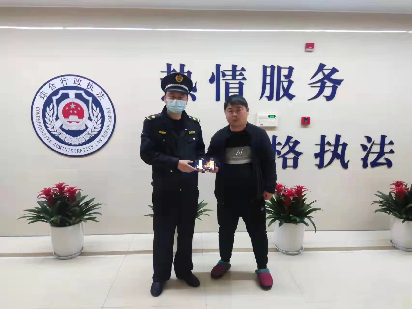 很快,一男子趕到星橋城管中隊(duì),經(jīng)過(guò)仔細(xì)核對(duì),確認(rèn)他是失主后,付留舉便將手機(jī)歸還給他,提醒他要保管好隨身物品。接過(guò)手機(jī),男子再三向付留舉表示感謝。