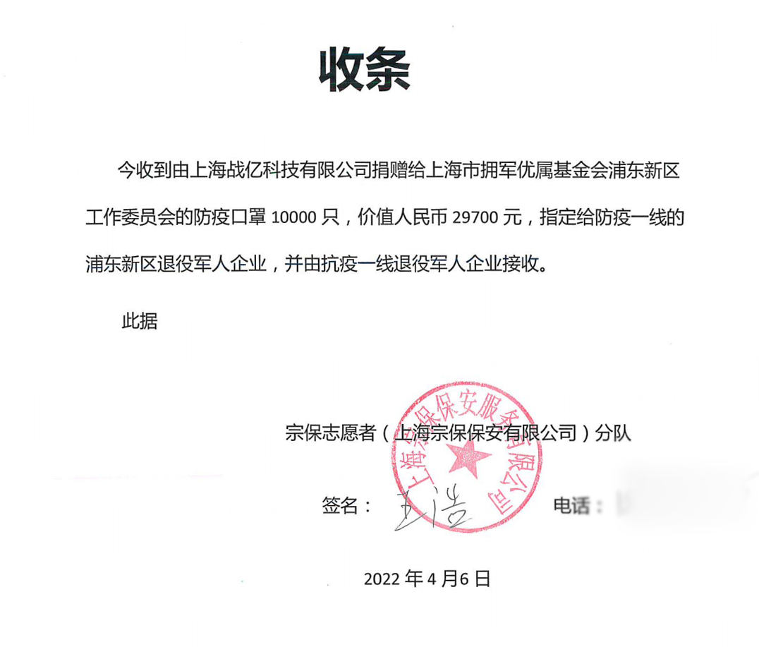 上海戰(zhàn)億科技有限公司通過上海市擁軍優(yōu)屬基金會(huì)浦東新區(qū)工作委員會(huì)向宗保公司捐贈(zèng)10000個(gè)防疫口罩。