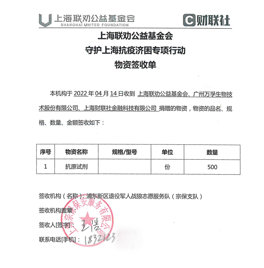 上海聯(lián)勸公益基金會(huì)、廣州萬孚生物技術(shù)股份公司、上海財(cái)聯(lián)社金融科技公司聯(lián)合向宗保公司捐贈(zèng)500份抗原試劑。