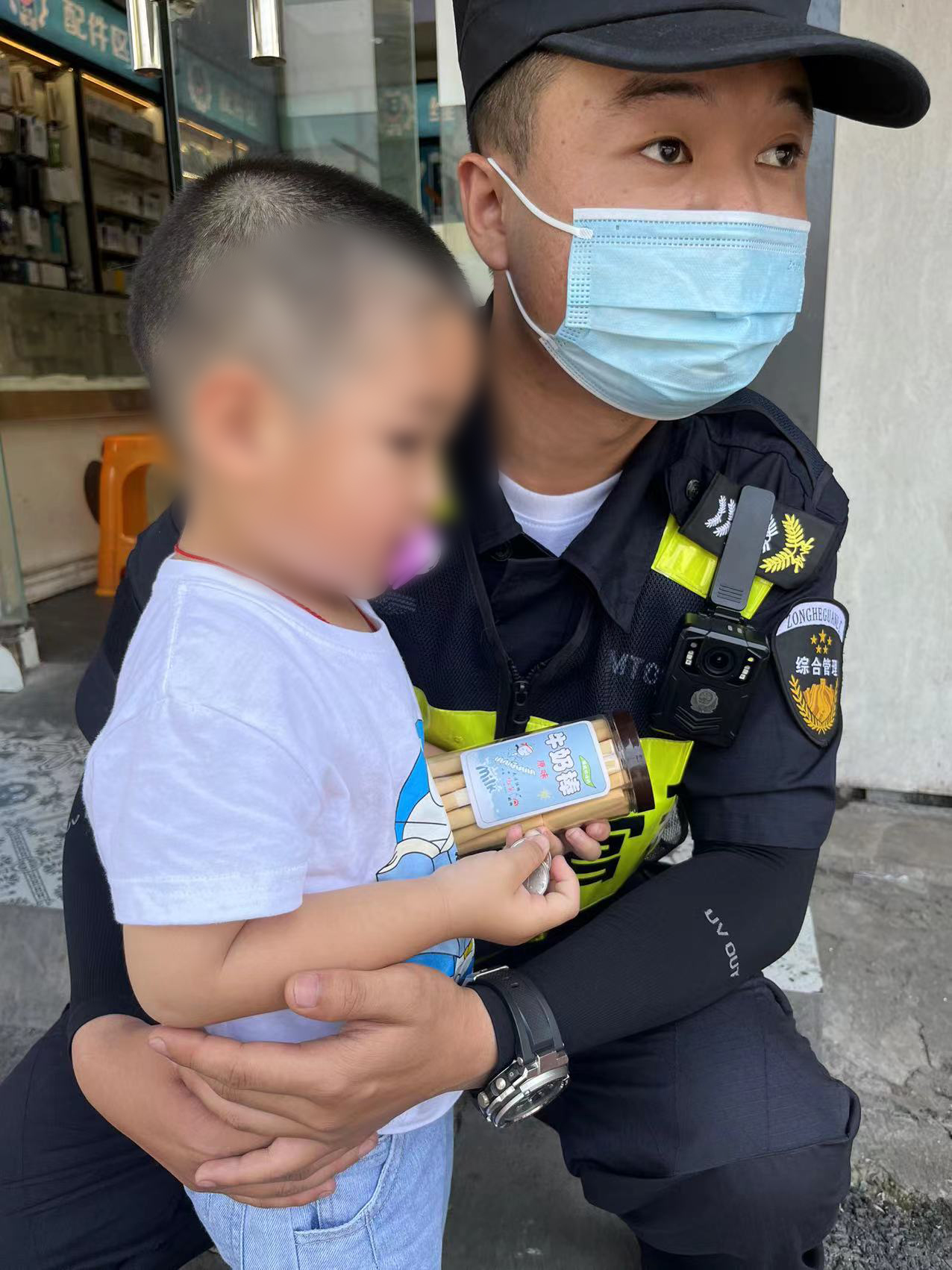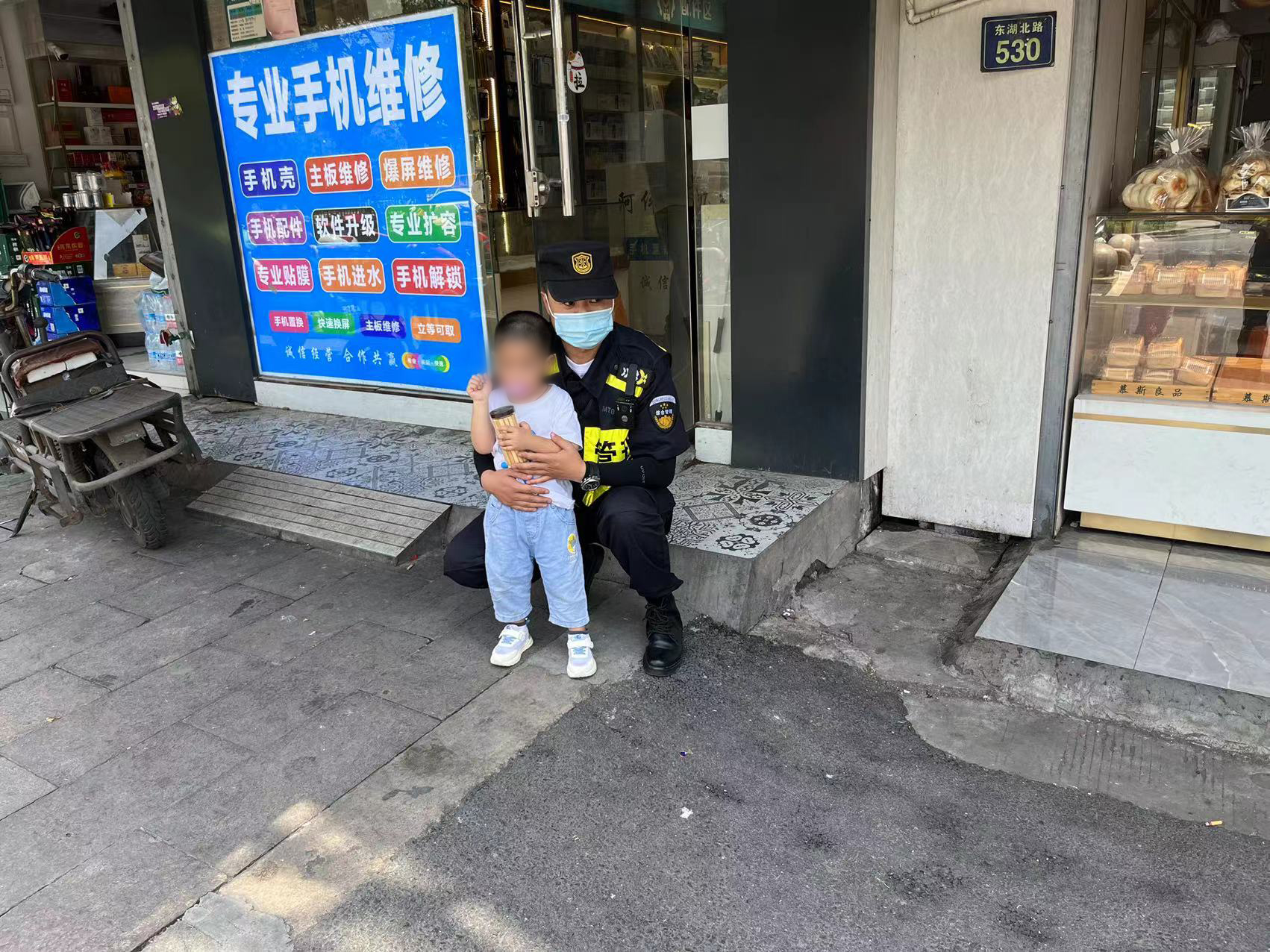 6月7日,浙江民泰駐運(yùn)河街道城管項(xiàng)目隊(duì)員幫助走散小男孩找到家人。