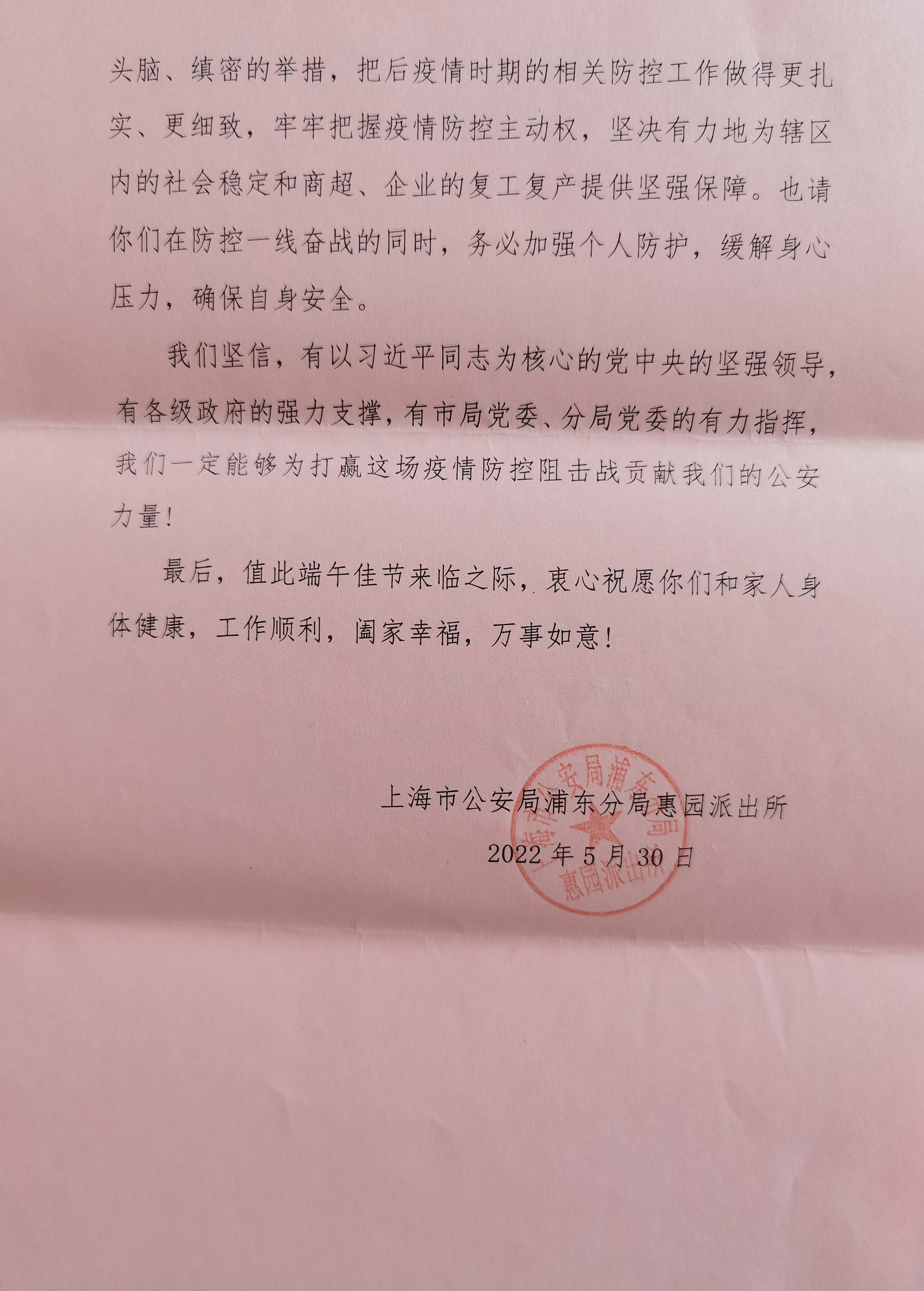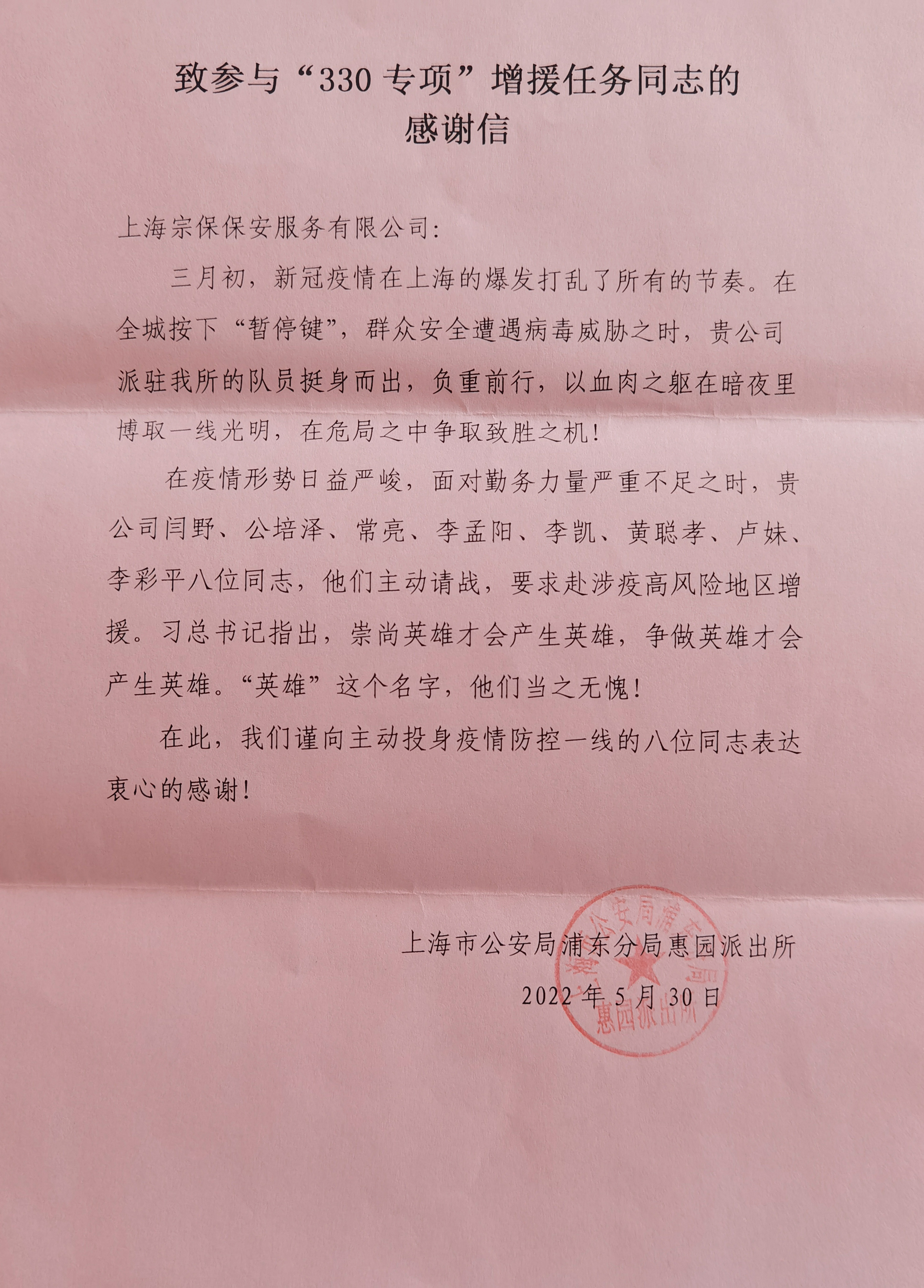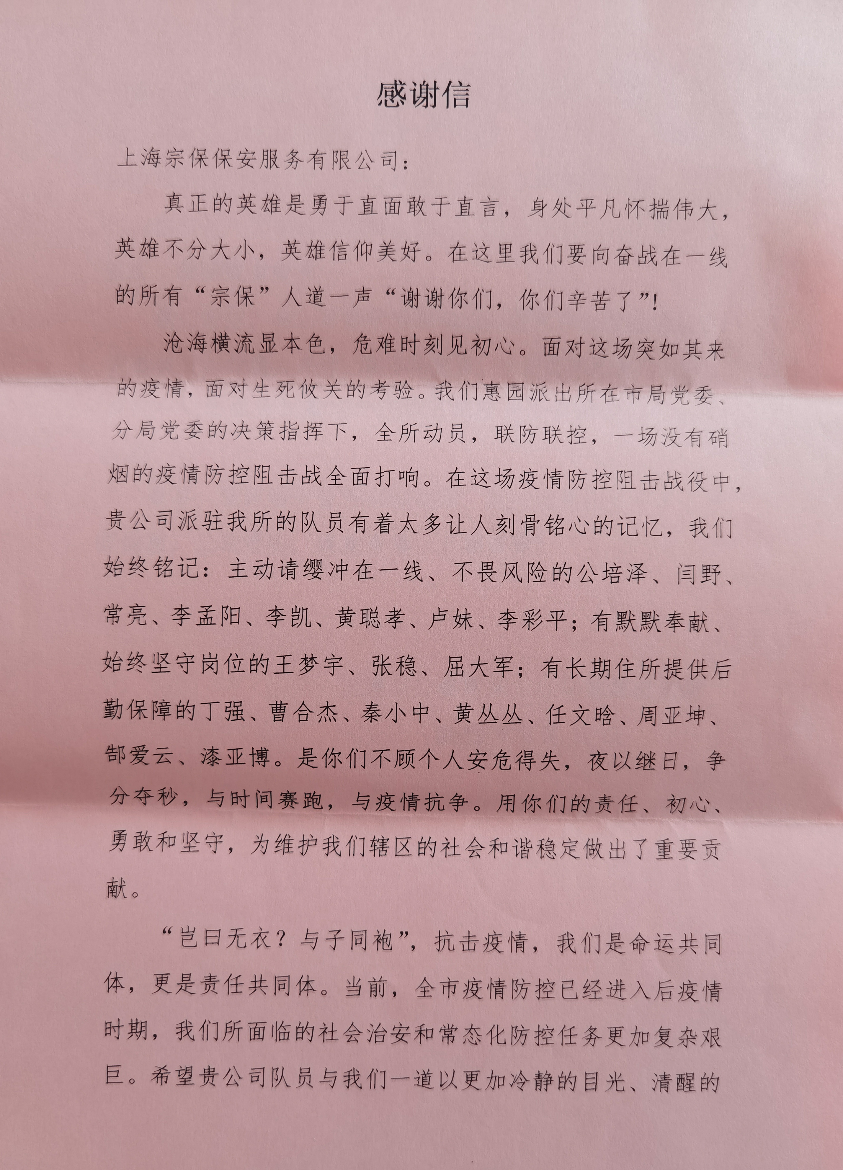 5月30日,宗保公司收到浦東公安分局惠園派出所的感謝信,衷心感謝宗保公司在疫情防控關(guān)鍵時(shí)期對(duì)其工作的大力支持。
