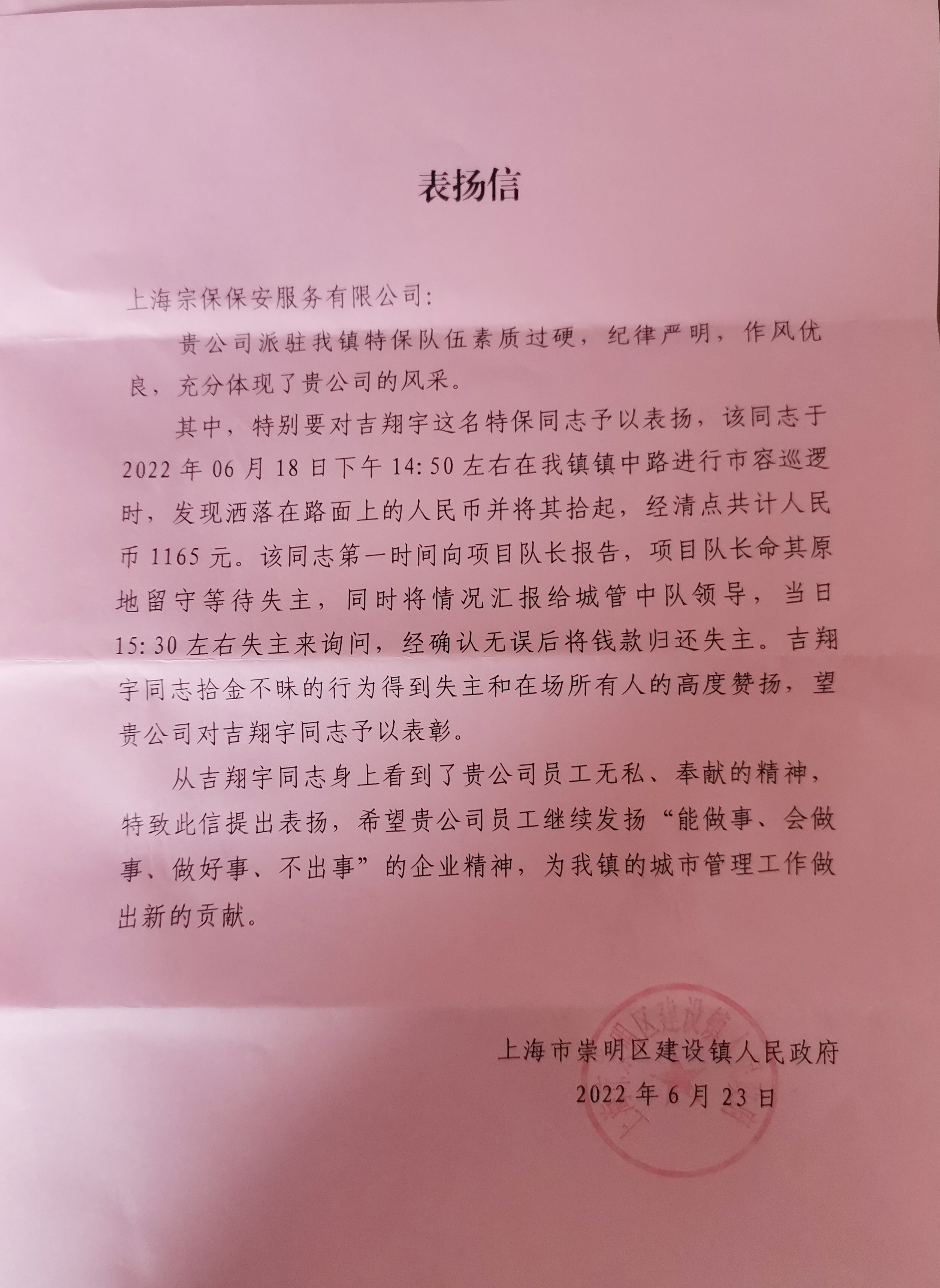 6月23日,宗保公司駐崇明區(qū)建設(shè)鎮(zhèn)項(xiàng)目收到建設(shè)鎮(zhèn)人民政府的一封表?yè)P(yáng)信,信中對(duì)公司員工吉翔宇拾金不昧的行為給予表?yè)P(yáng)。